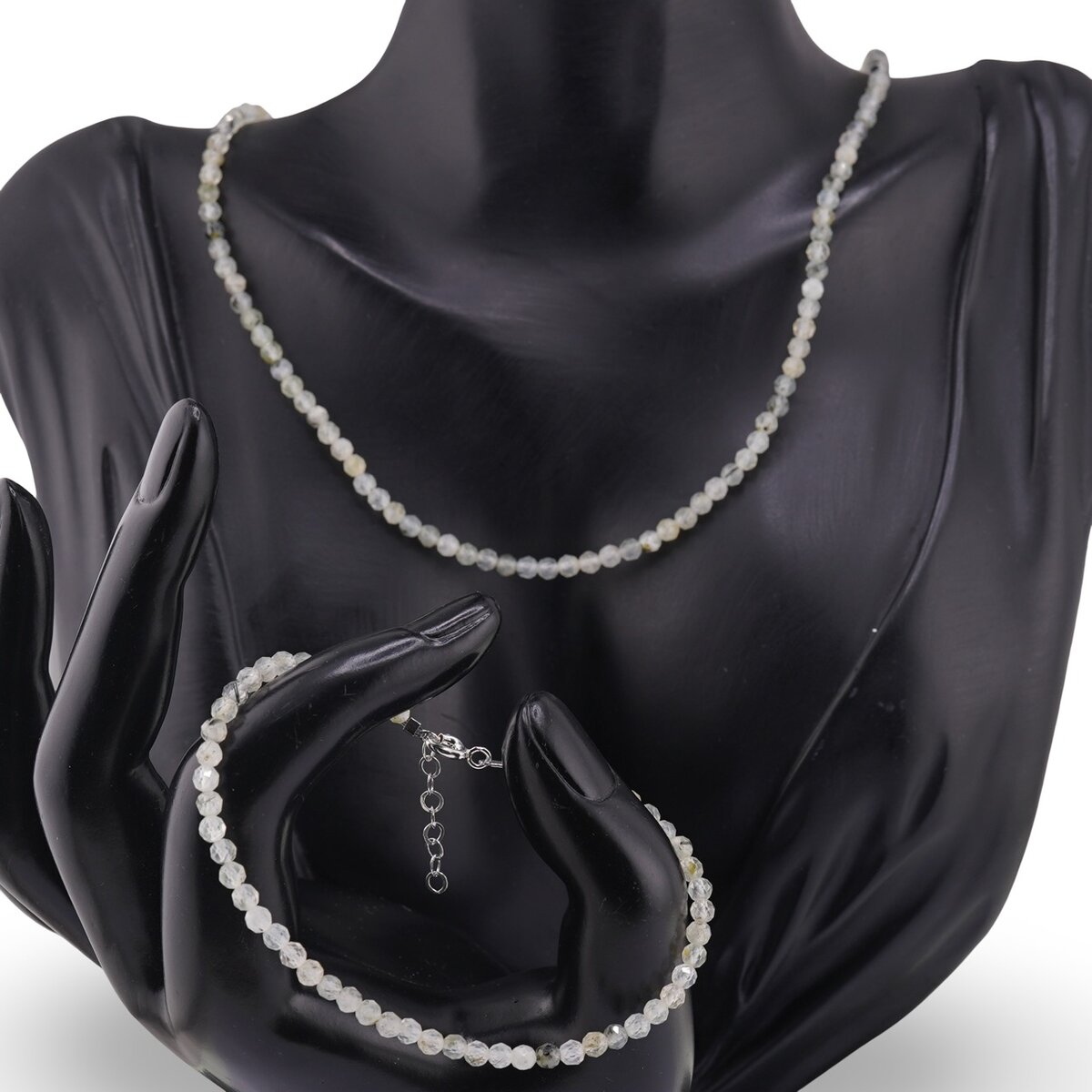 Delicat și plin de naturalețe, acest set de bijuterii reunește o brățară și un colier lucrate din Prehnit natural, cu sfere fațetate de 3 mm în nuanțe de verde proaspăt. Colierul are o lungime de 43 cm, așezându-se confortabil la baza gâtului, iar luciul discret al fațetelor aduce un plus de rafinament atât ținutelor de zi, cât și celor de ocazie.