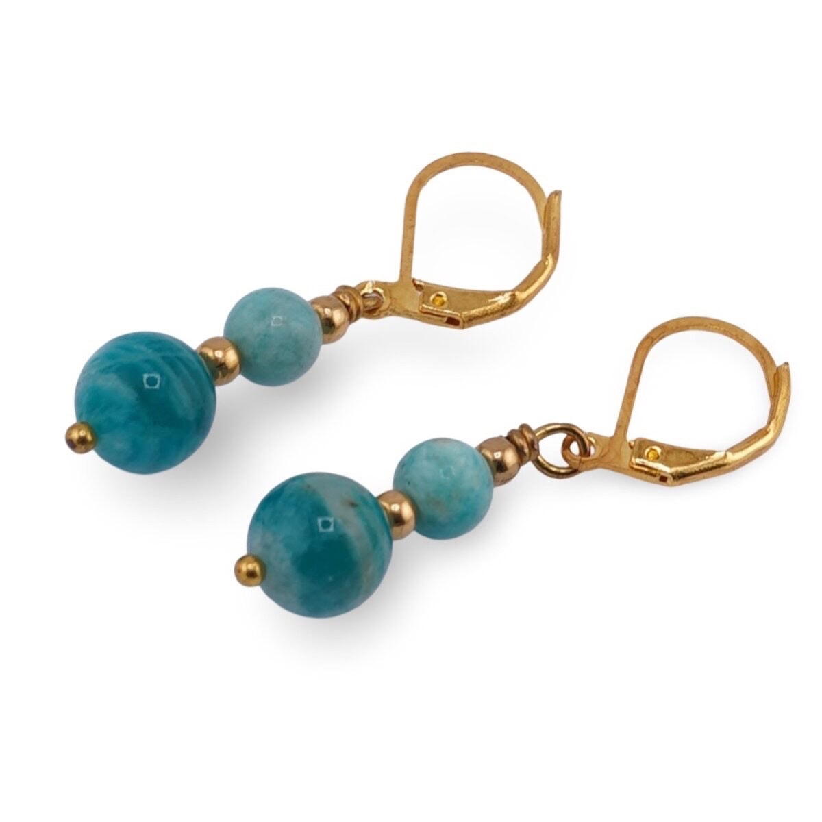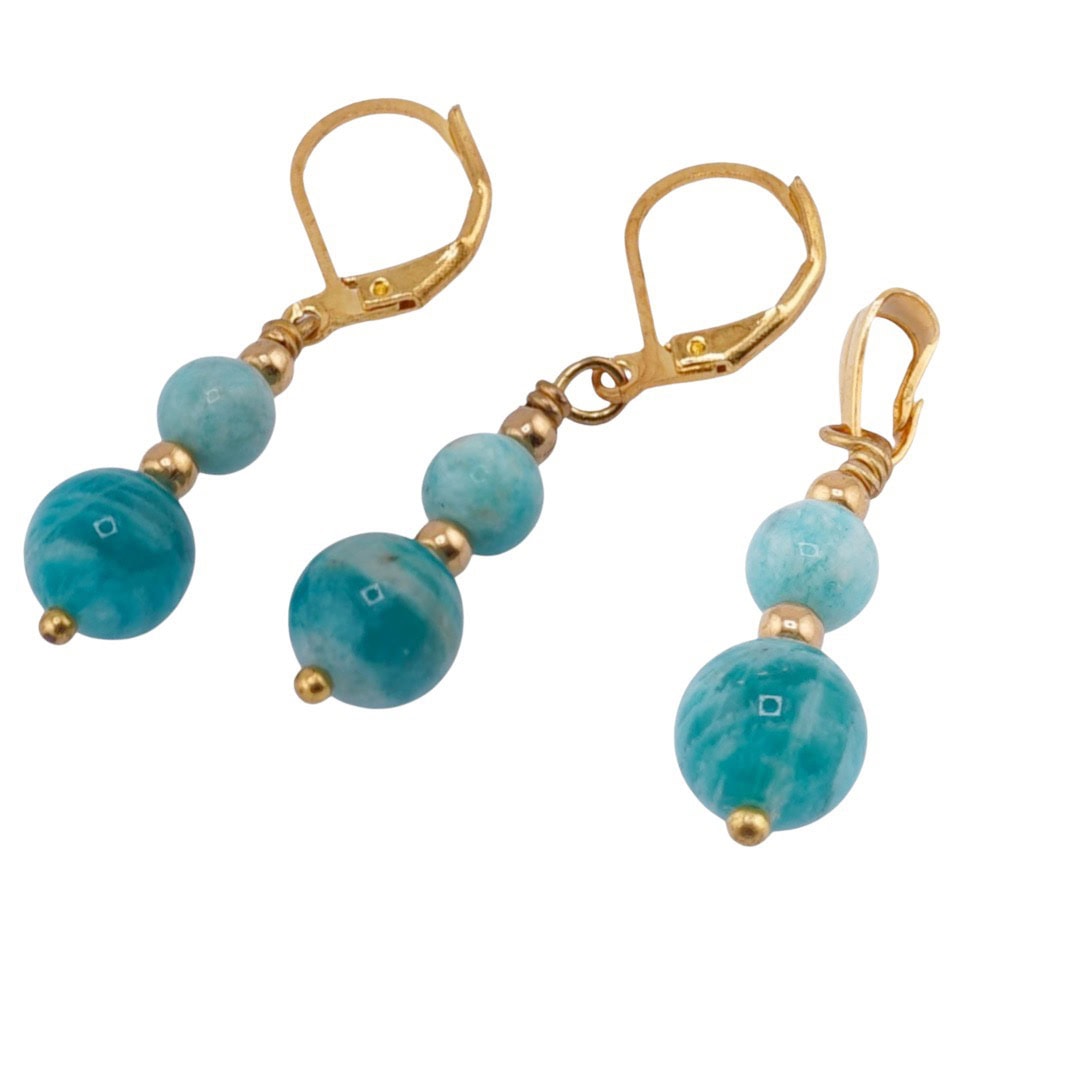 Acest set de cercei și pandantiv din amazonit de Rusia, format din sfere delicate de 6–8 mm, este creat pentru tine dacă îți dorești bijuterii care să îmbine frumusețea naturală a cristalelor cu o energie blândă și susținătoare. Nuanțele de albastru ale amazonitului, puse în valoare de metalul auriu și de micii bumbi decorativi, dau un aspect calm, ușor elegant, potrivit atât pentru fiecare zi, cât și pentru momentele în care vrei să te simți mai aproape de tine.