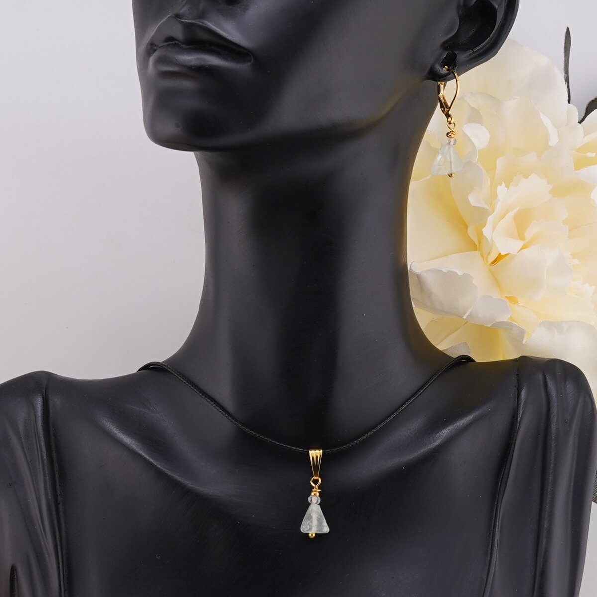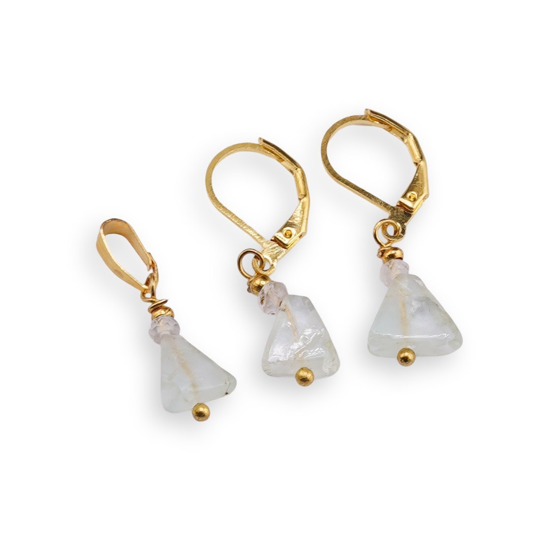 Set Cercei si Pandantiv Fluorit triunghi 7-8mm si Cristal de stanca discuri fatetate 3mm cu inox auriu