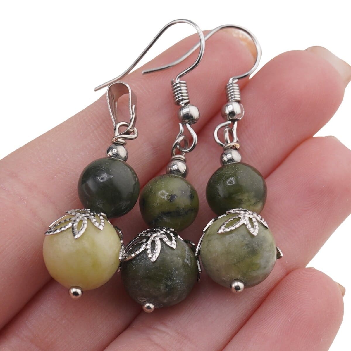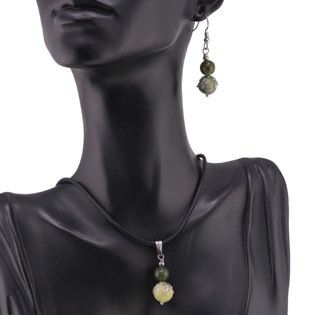 Set cercei si pandantiv Jad nefrit sfere si flori argintii, 8-10mm