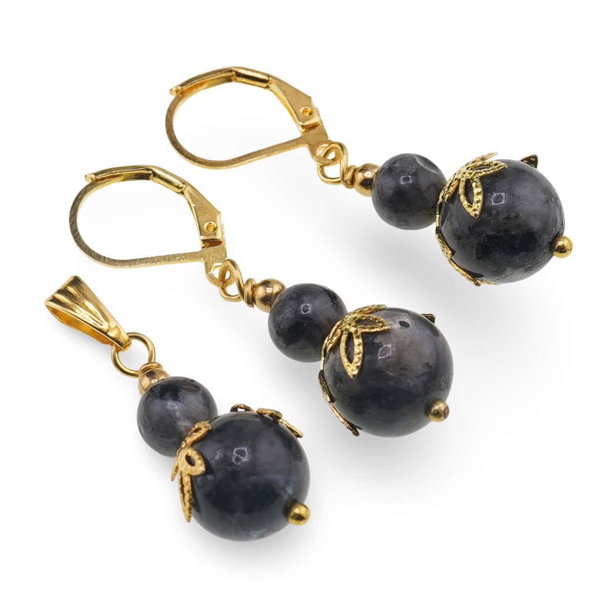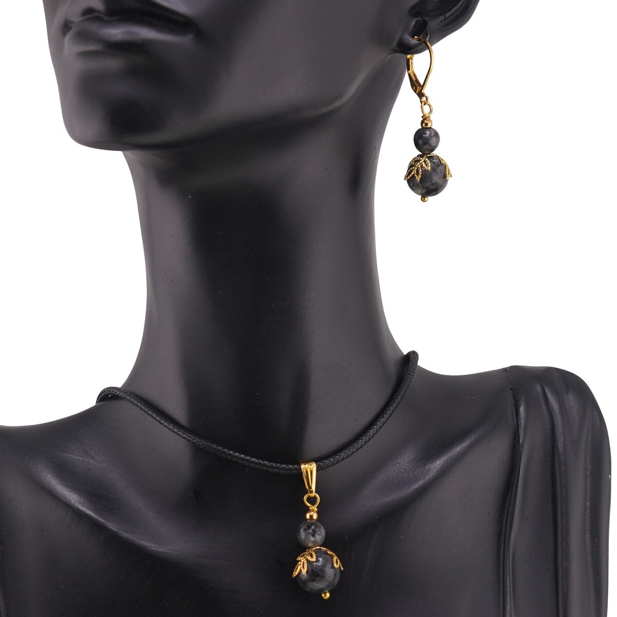 Set cercei și pandantiv Larvikit sfere și flori aurii, 6–10mm