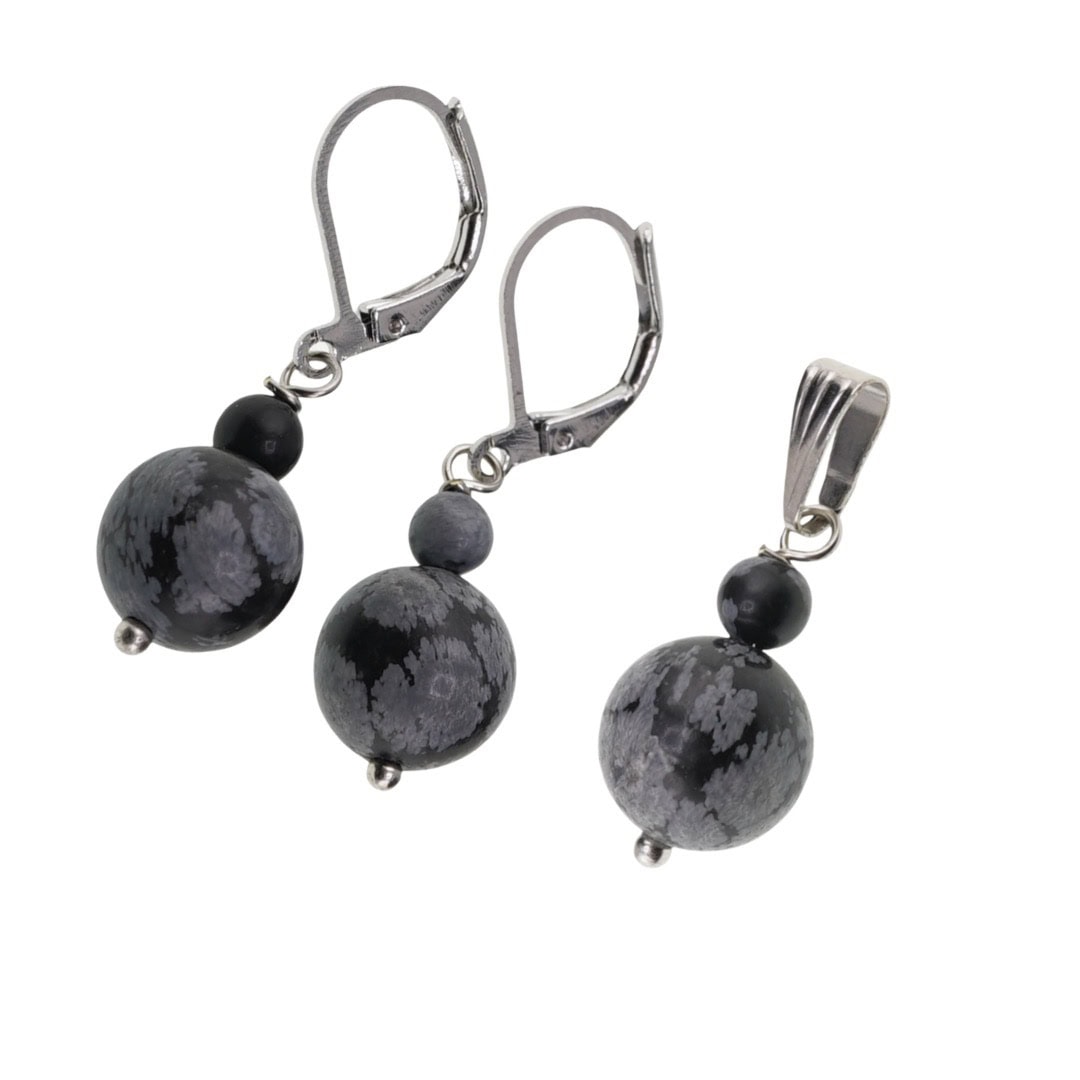 Setul de cercei și pandantiv din Obsidian fulg de nea este o alegere potrivită pentru tine dacă îți dorești bijuterii discrete, dar pline de semnificație. Nuanțele de negru și gri ale obsidianului, presărate cu mici „fulgi” luminoși, creează un contrast plăcut, ușor de asortat atât la ținute de zi cu zi, cât și la momente speciale.