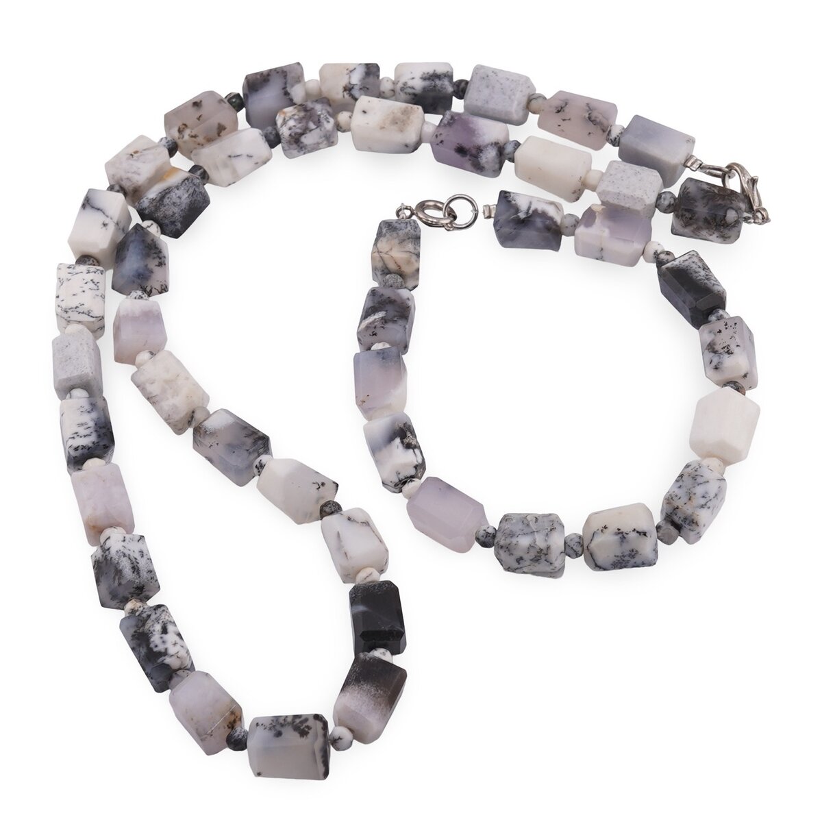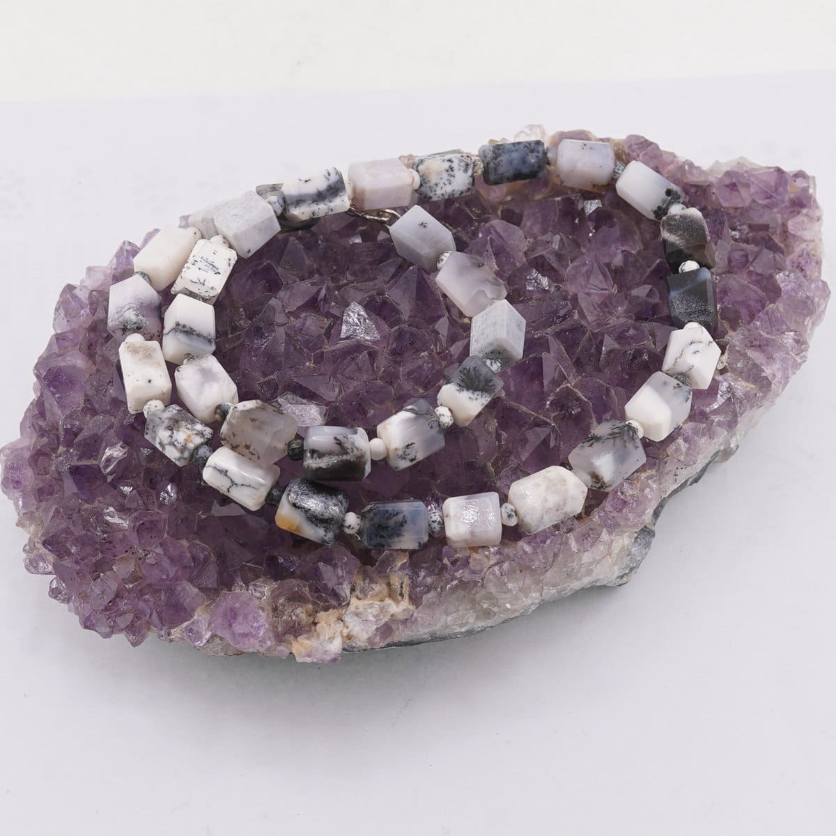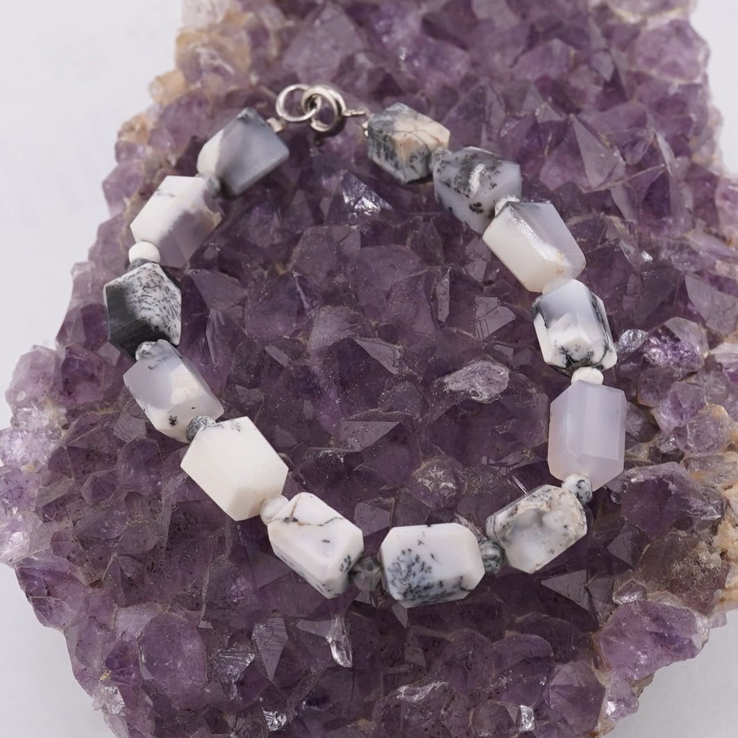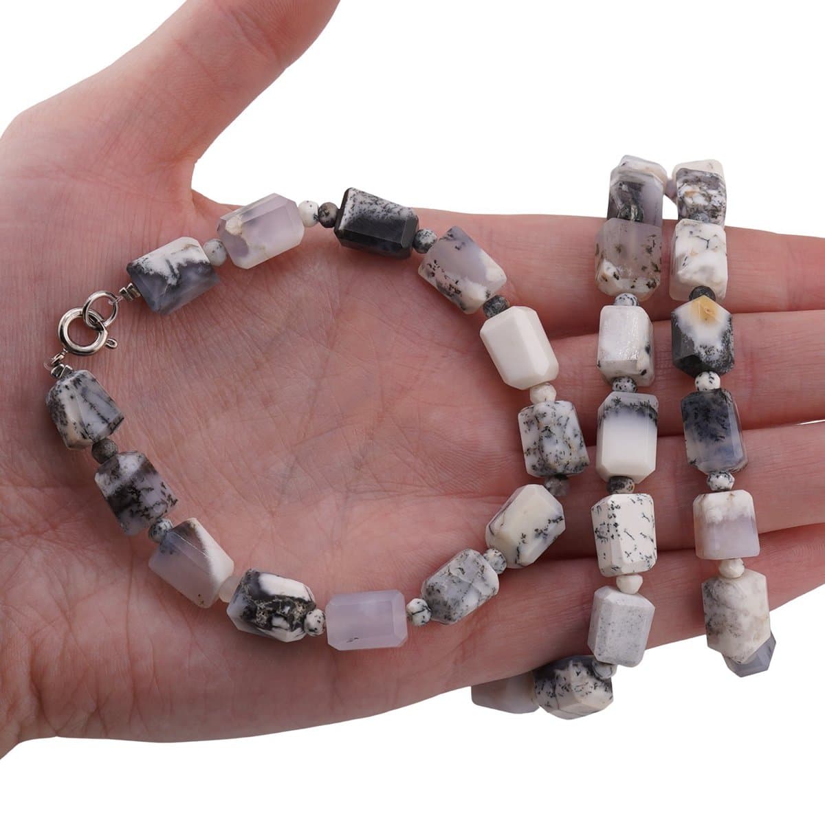 Descoperă un set de bijuterii creat pentru a-ți pune în valoare stilul de zi cu zi: colierul și brățara din Agat dendritic combină nuanțe naturale de alb și gri cu reflexii discrete, obținute prin fațetare atentă. Pietrele păstrează desenul dendritic specific, asemănător unor ramuri fine, astfel încât fiecare piesă spune o poveste inspirată din natură.