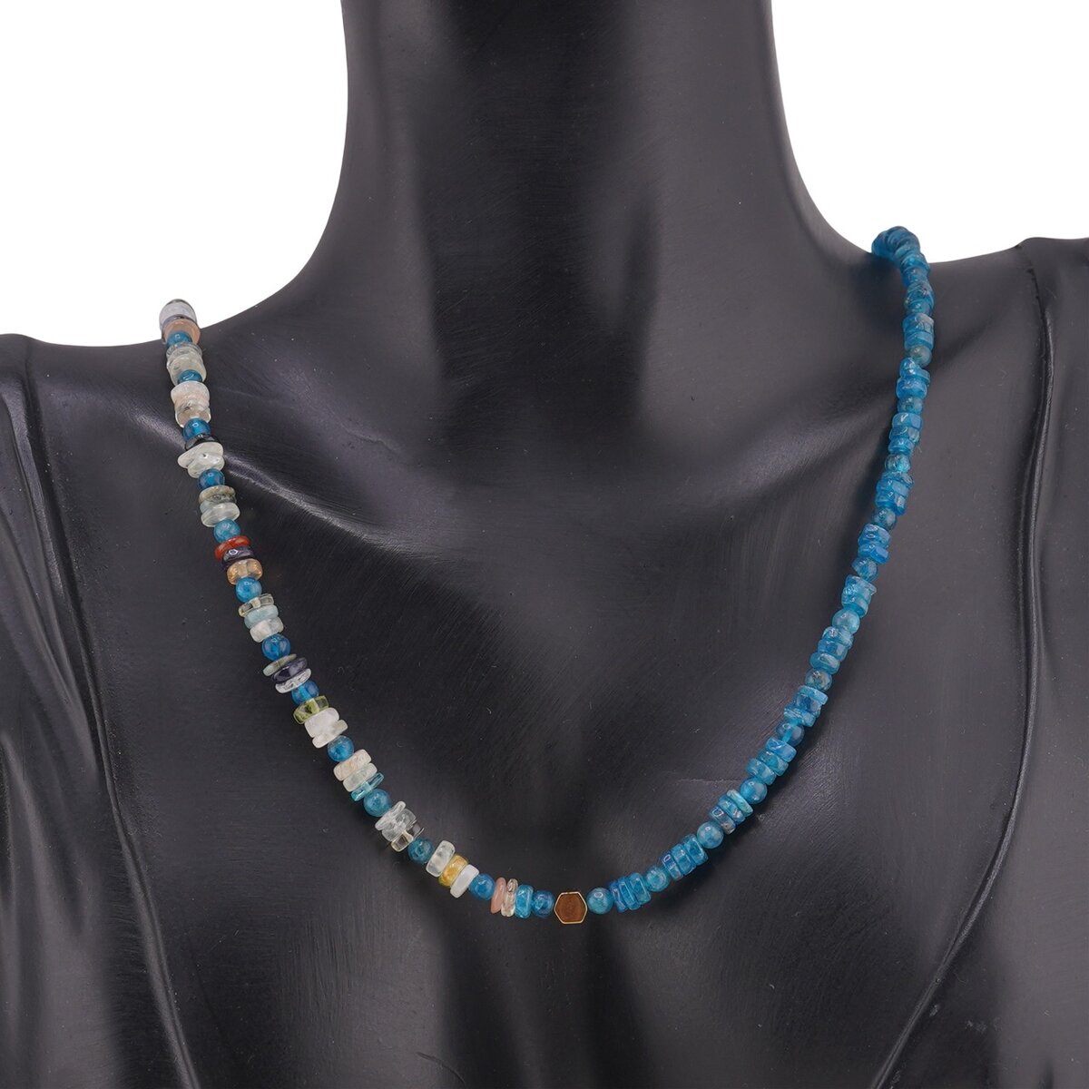 Acest set de colier și brățară este creat pentru tine dacă îți dorești bijuterii din cristale naturale care să îmbine energia culorilor cu o notă discretă de rafinament. Apatitul albastru în sfere fine de 3 mm se împletește cu rondele multicolore de cristale de 4 mm și este pus în valoare de accentele de Hematit auriu, oferind un joc plăcut de nuanțe reci și calde.