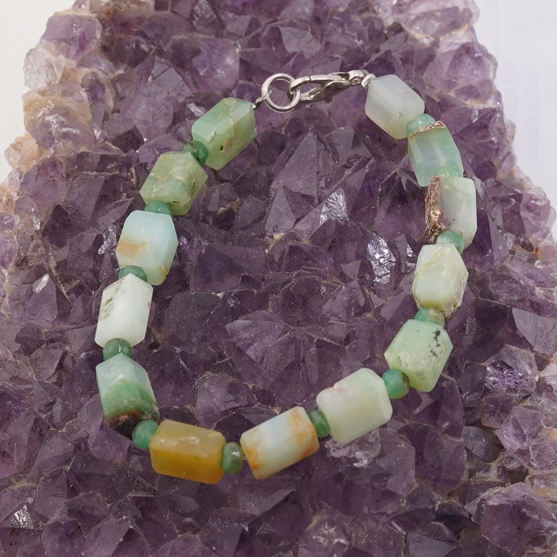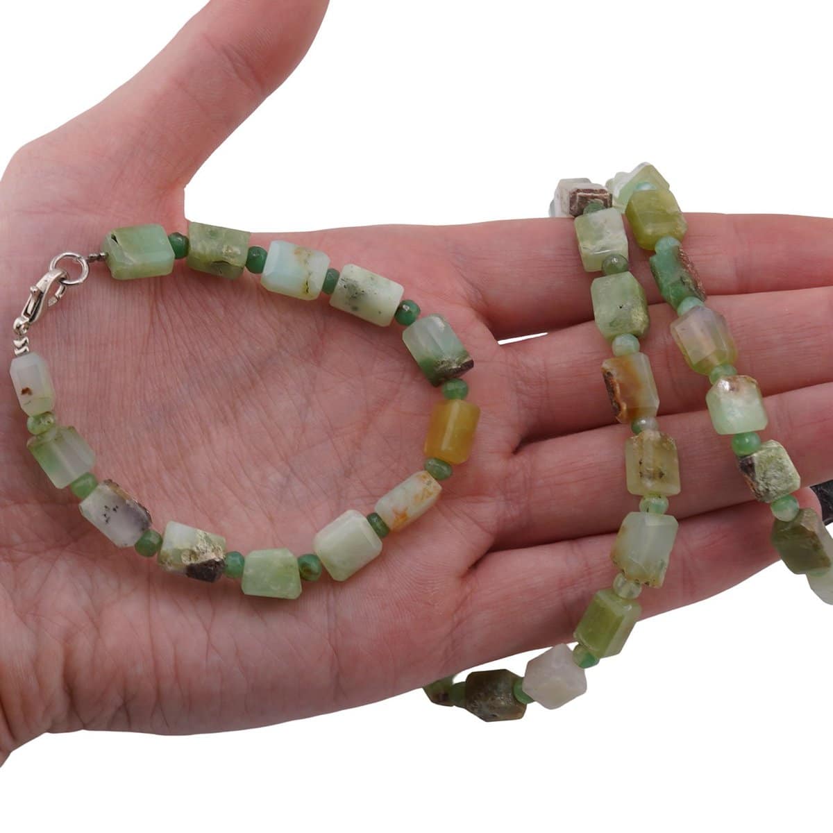 Un set de bijuterii creat pentru echilibru și prezență, colierul și brățara reunesc cristale naturale verzi fațetate, cu reflexii fine ce prind lumina discret. Piatra folosită este crisocola, cunoscută și ca Chrysocolla sau „Piatra comunicării divine”, apreciată pentru energia blândă ce încurajează exprimarea autentică și stabilitatea interioară. Colierul se așază confortabil la baza gâtului, având aproximativ 43–44 cm, iar alternanța dintre pietrele fațetate de 9–10 mm și discurile fațetate de 4 mm creează un ritm vizual plăcut, completat de forme dreptunghiulare fațetate și accesorii din metal comun sau argint 925.
