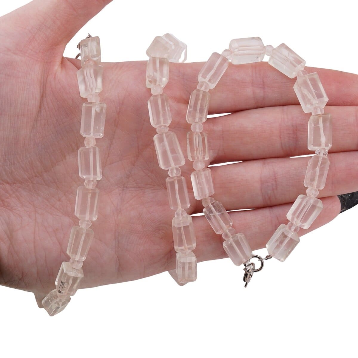 Dacă iubești nuanțele calde de roz și strălucirea discretă a pietrelor fațetate, acest set de bijuterii din cuart roz autentic este pentru tine. Colierul și brățara sunt realizate din cristal natural 100%, combinând discuri fațetate de aproximativ 4 mm cu accente geometrice dreptunghiulare fațetate de 10–11 mm. Textura variată prinde frumos lumina și pune în valoare finețea culorii, oferind un aspect armonios și modern.