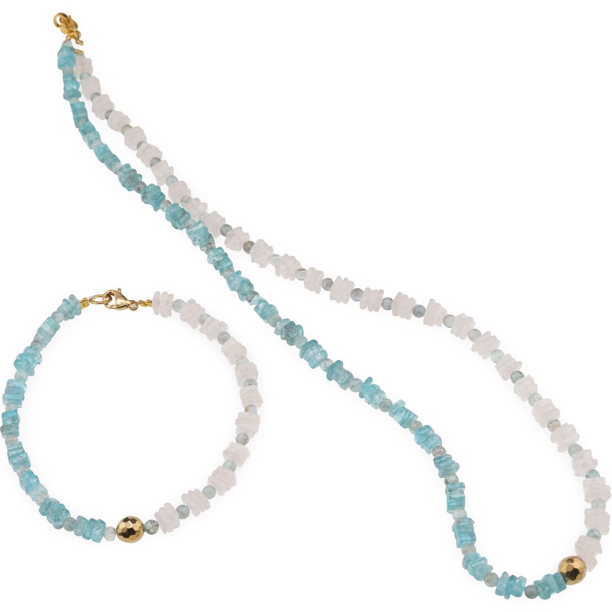 Set colier si bratara Cuart roz si Apatit patratele 5mm, Acvamarin sfere 3mm si Hematit auriu