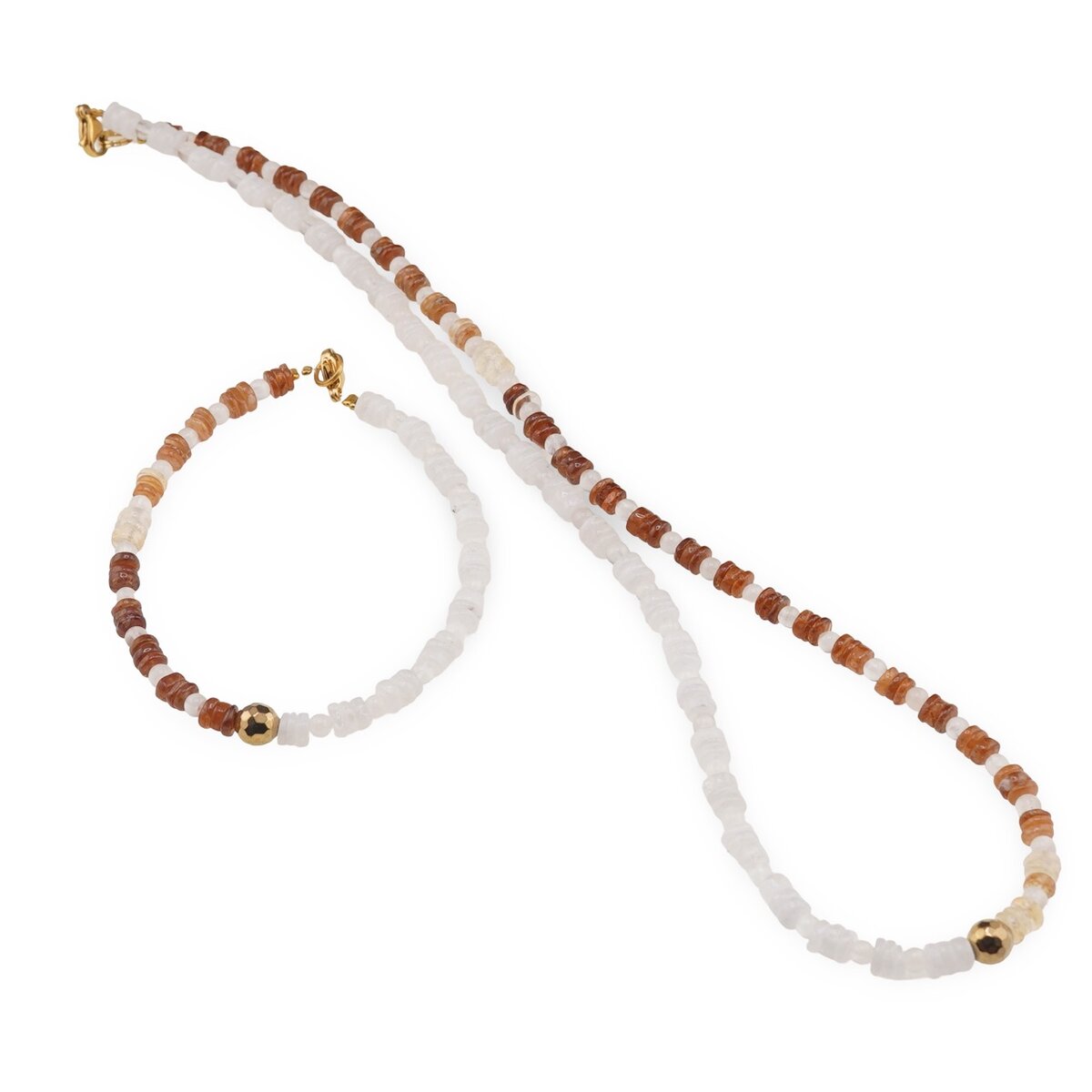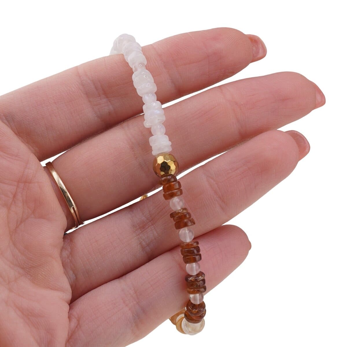 Setul de colier și brățară din granat Hessonit, piatră lunii și hematit auriu este creat pentru tine dacă îți dorești bijuterii din cristal natural, ușor de purtat zi de zi, care să îmbine eleganța cu o energie calmă și stabilă. Nuanțele calde de maro și alb, puse în valoare de accentele aurii, creează un joc discret de lumini ce se potrivește atât unui stil lejer, cât și ținutelor mai rafinate.