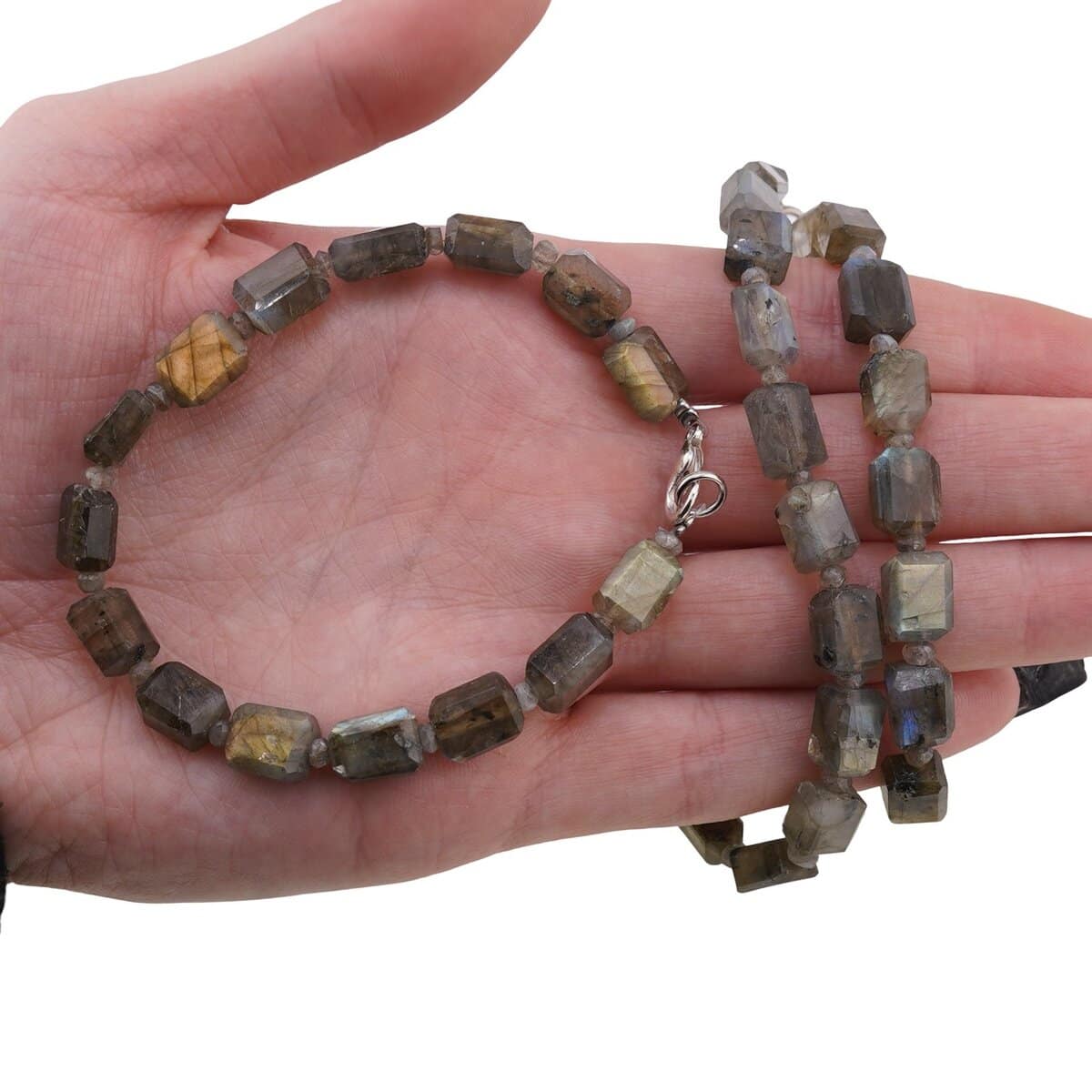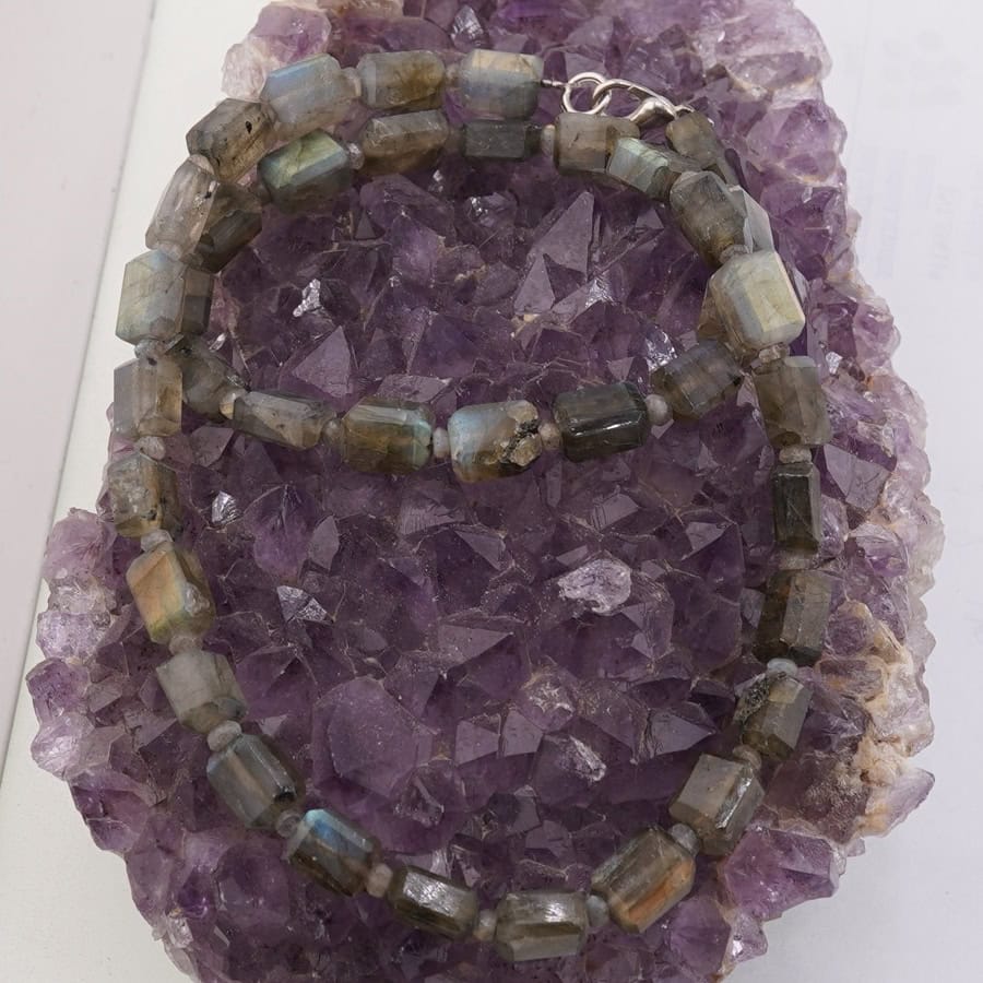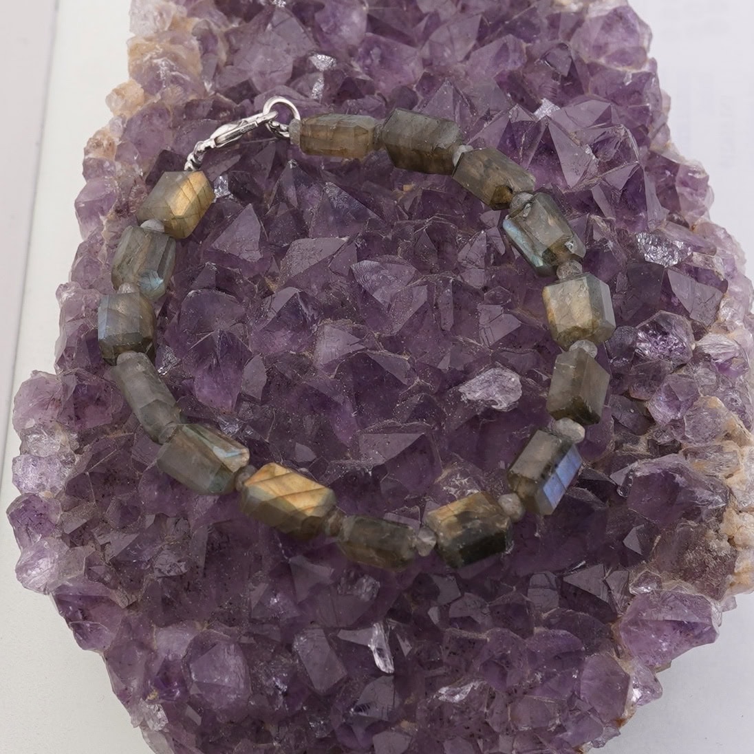 Pietrele sunt 100% cristal natural, combinate cu elemente metalice din metal comun sau argint 925, pentru un aspect curat și modern. Jocul de forme — discuri fațetate de 4 mm și elemente fațetate de 9–10 mm, cu tăietură tip dreptunghi — pune în valoare textura de feldspat plagioclazic, cunoscut și ca labradorite sau „piatra magiei”.