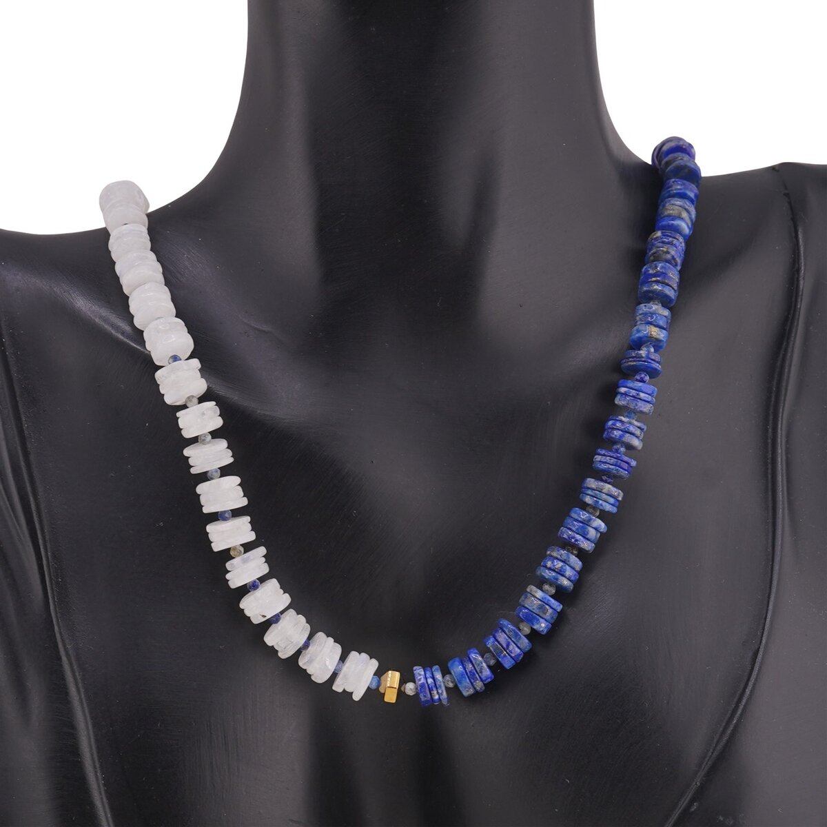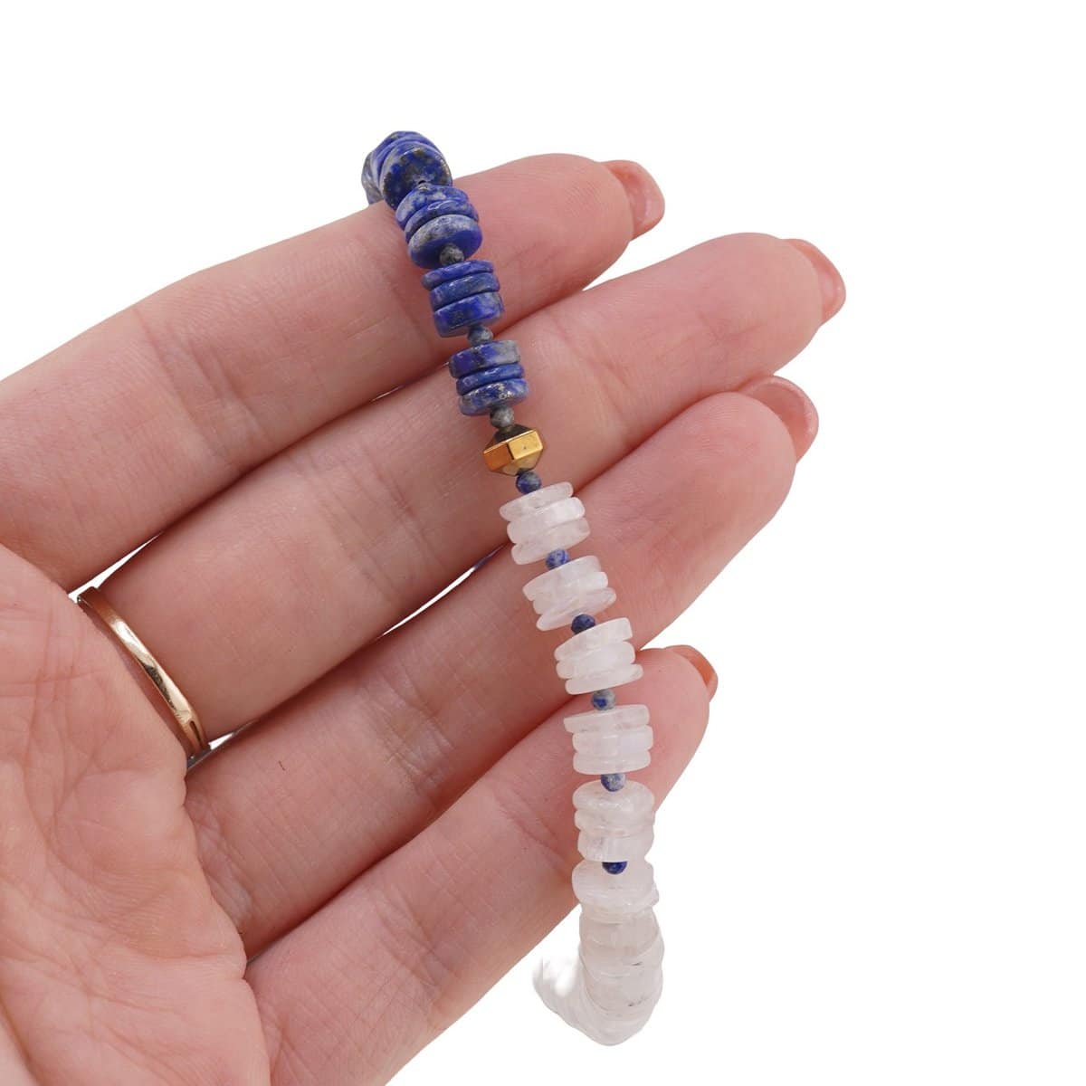 Acest set de colier și brățară îmbină cu finețe nuanțele de albastru profund ale Lapisului Lazuli cu strălucirea delicată a Pietrei lunii și accentele calde de Hematit auriu. Tonurile de alb și albastru se completează armonios, iar formele de rondele și sfere fațetate de 2–7 mm creează un joc plăcut de texturi, discret, dar ușor de remarcat la orice ținută.