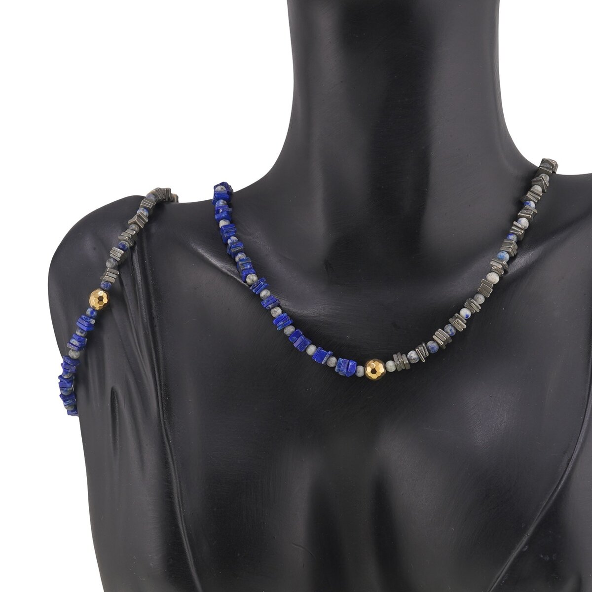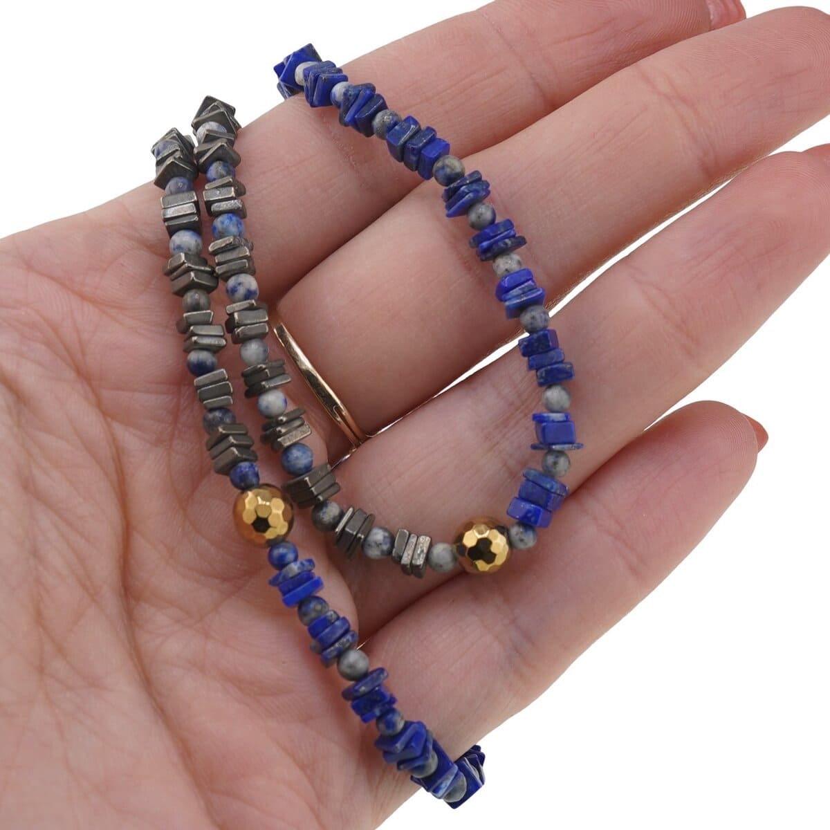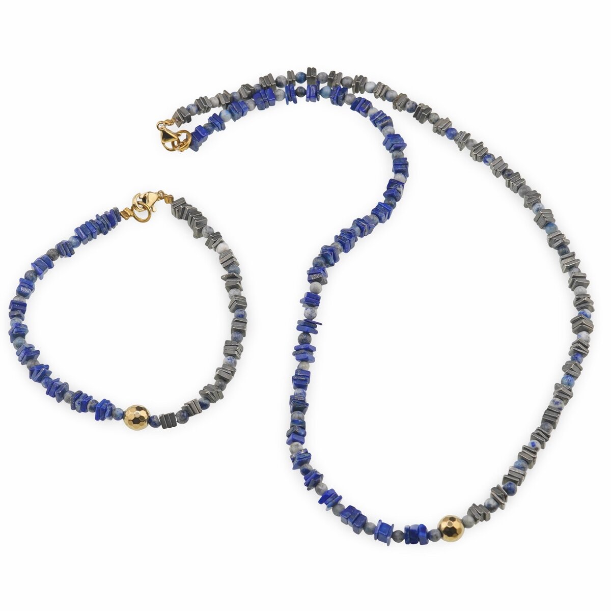 Acest set de bijuterii din cristale naturale este creat pentru tine dacă îți dorești mai multă claritate, stabilitate și încredere în propriul drum. Colierul de aproximativ 43 cm și brățara asortată îmbină nuanțele intense de albastru ale Lapisului Lazuli cu strălucirea discretă a Piritei și reflexele metalice ale Hematitului auriu, într-un joc echilibrat de culori albastre și gri.