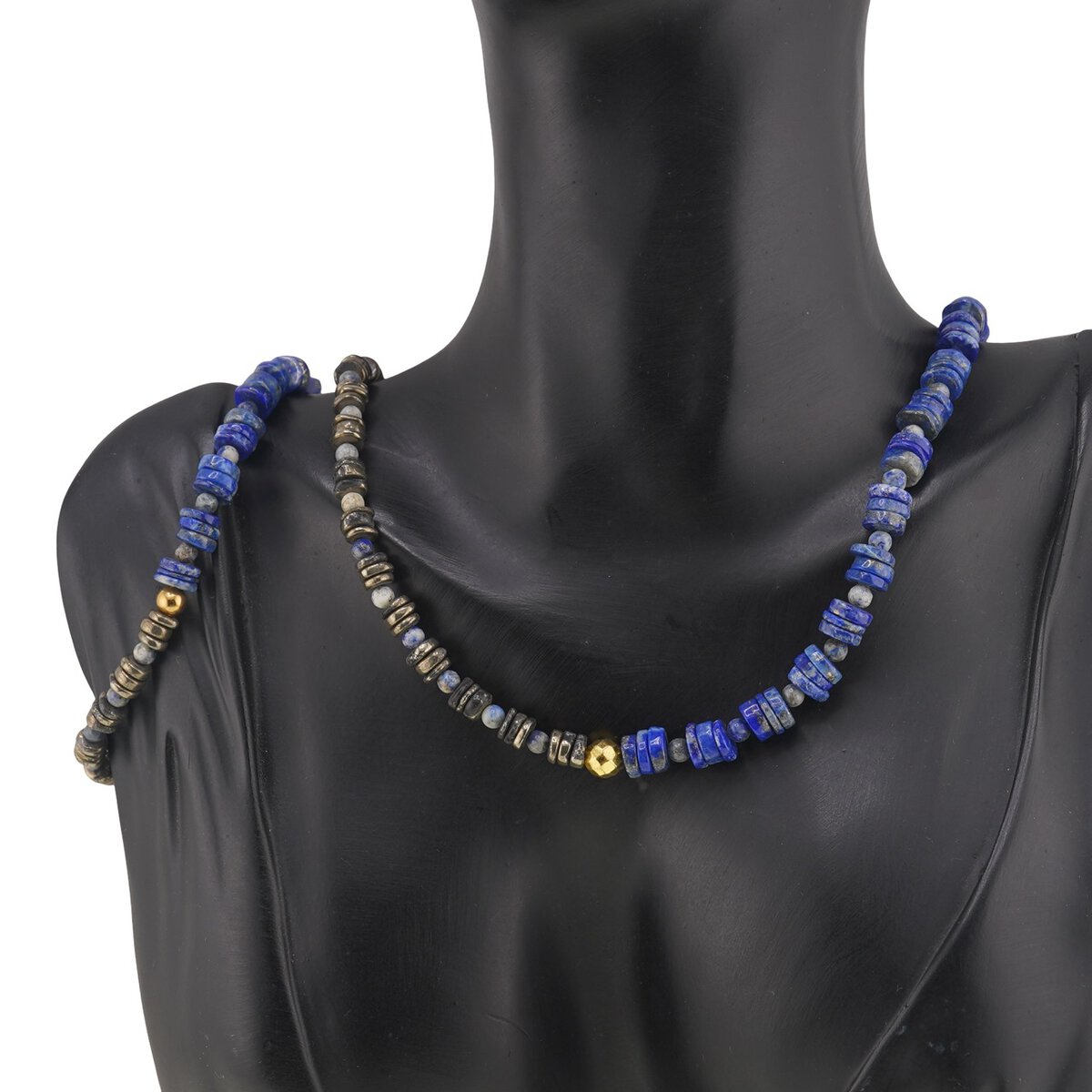 Rondelele de 6–7 mm din lapis lazuli și pirita, cunoscută și ca „aurul nebunilor” sau „pyrite”, aduc un plus de încredere, energie și vitalitate. Pirita este adesea folosită pentru atragerea abundenței financiare și pentru protecție energetică, fiind asociată cu elementele foc și pământ, dar și cu planete puternice precum Soarele, Marte, Jupiter și Saturn. Împreună, aceste pietre semiprețioase susțin împământarea, stabilitatea și o atitudine mai practică în viața de zi cu zi.