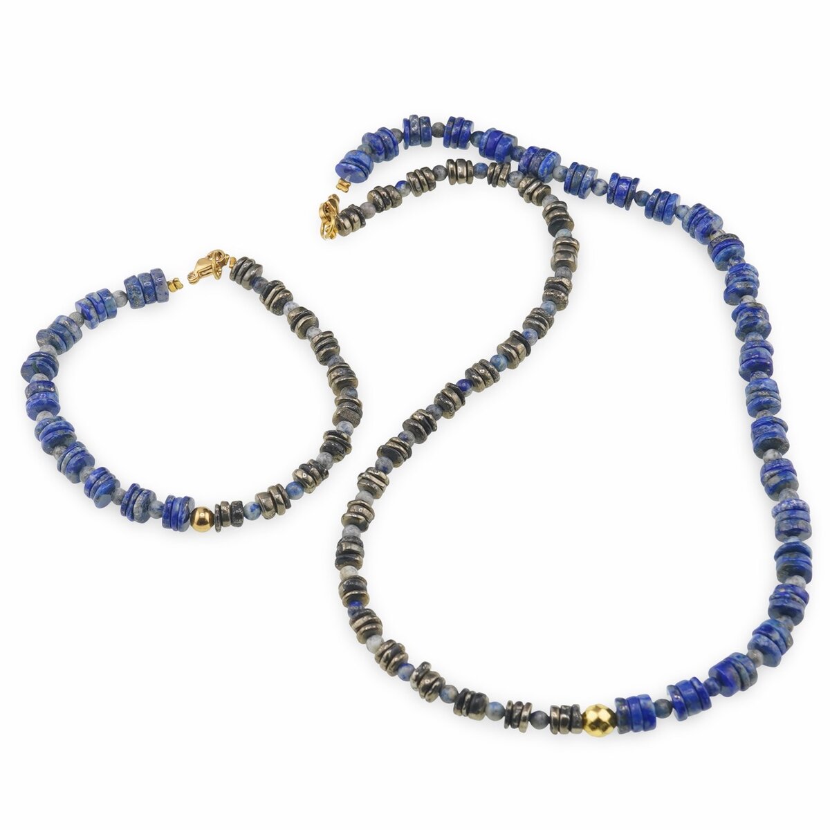 Acest set de bijuterii este creat pentru tine dacă îți dorești să porți cristale naturale aproape de corp, într-o formă elegantă și ușor de integrat în orice ținută. Colierul și brățara îmbină nuanțele de albastru intens ale lapisului lazuli cu reflexiile gri-metalice ale piritei și strălucirea caldă a hematitului auriu, într-un joc echilibrat de culori și energii.