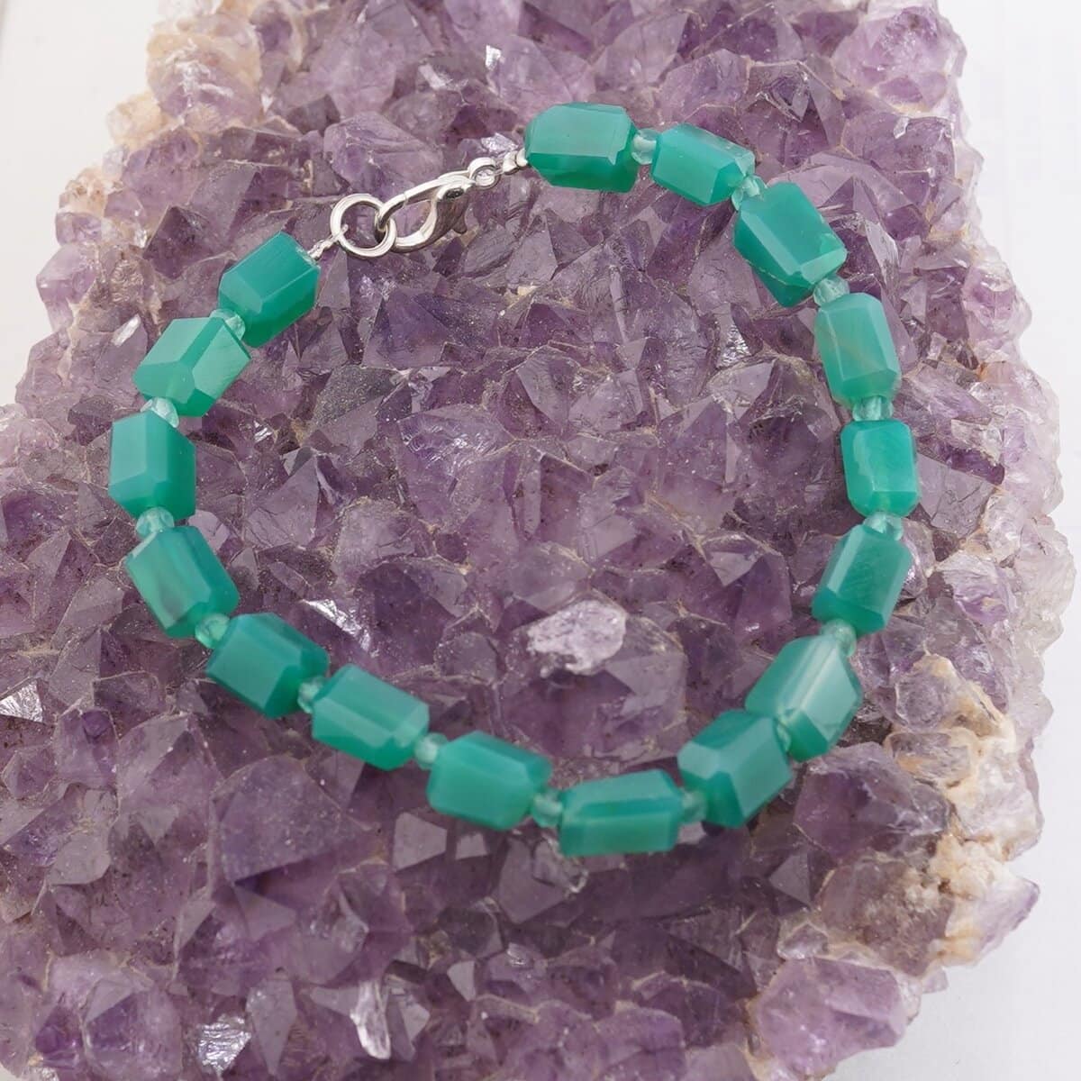 Colierul așezat plăcut la baza gâtului, cu o lungime de aproximativ 43–44 cm, îmbină discuri fine fațetate de 3 mm cu elemente fațetate de 8–9 mm, creând un ritm vizual armonios. Brățara completează discret ansamblul, astfel încât să îl poți purta împreună sau separat, în funcție de stilul tău. Piesele sunt realizate din cristal natural autentic, cunoscut și ca Onyx (o varietate de calcedonie stratificată), și sunt însoțite de elemente metalice din metal comun sau argint 925, pentru un plus de durabilitate și confort.