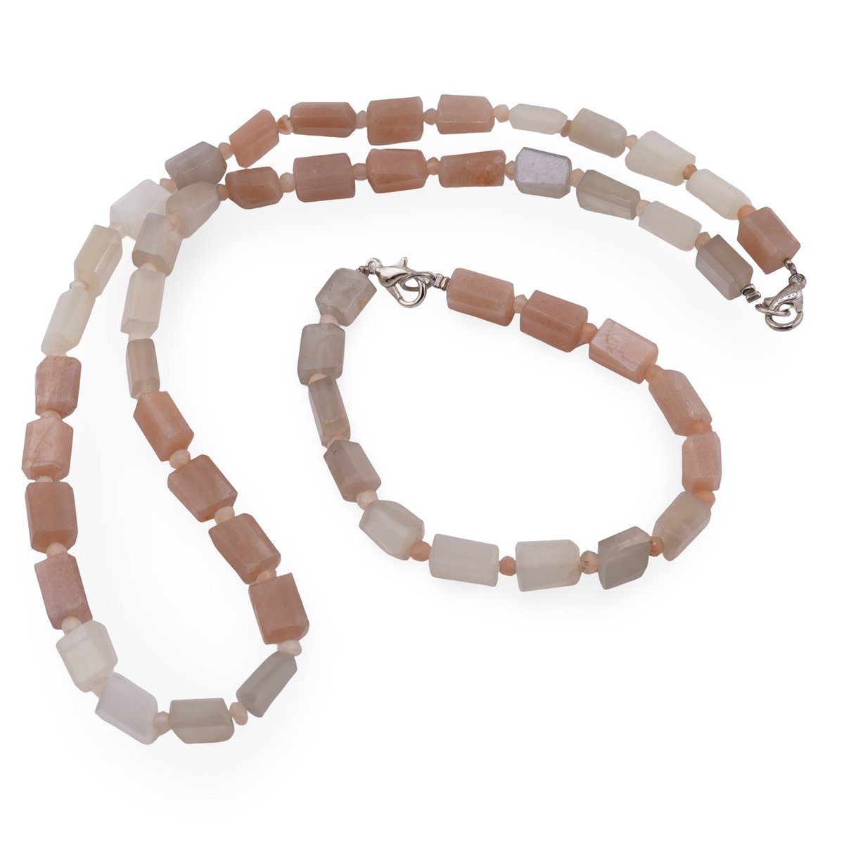 Alege un set discret și expresiv, creat din Piatra lunii naturală 100%, în nuanțe degrade de la gri diafan la accente calde de portocaliu. Colierul și brățara combină dreptunghiuri fațetate de 8–10 mm cu discuri fațetate de 4 mm, oferind o strălucire fină care prinde frumos lumina. Piesele sunt completate de accesorii metalice din metal comun sau argint 925 și au o cădere plăcută, colierul având aproximativ 43–44 cm.