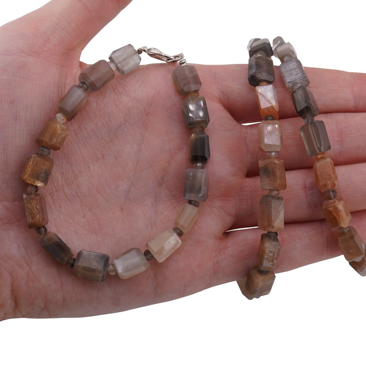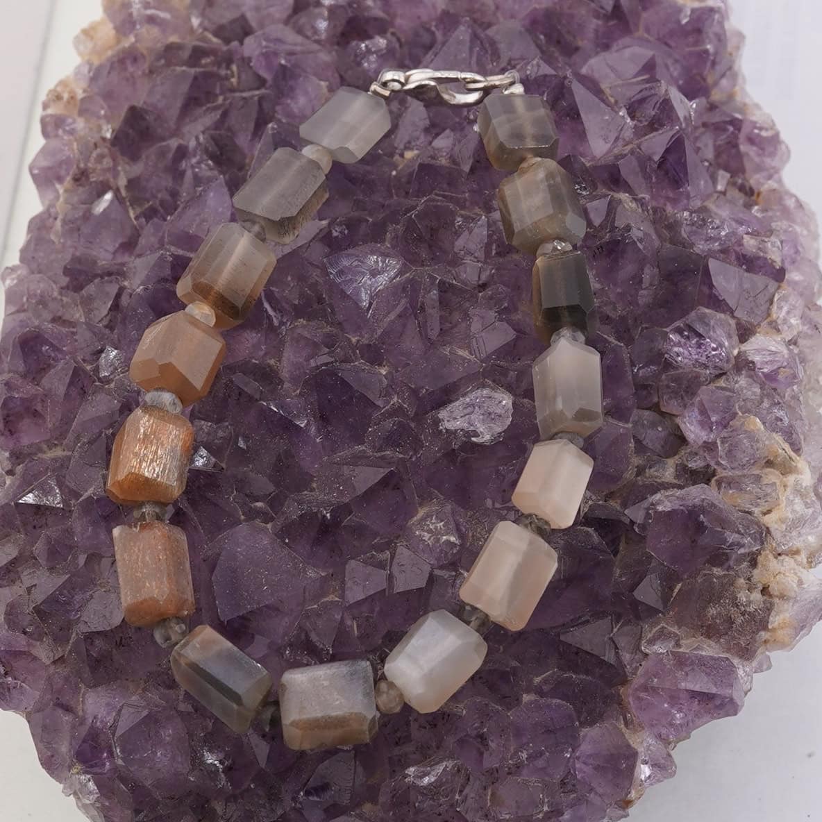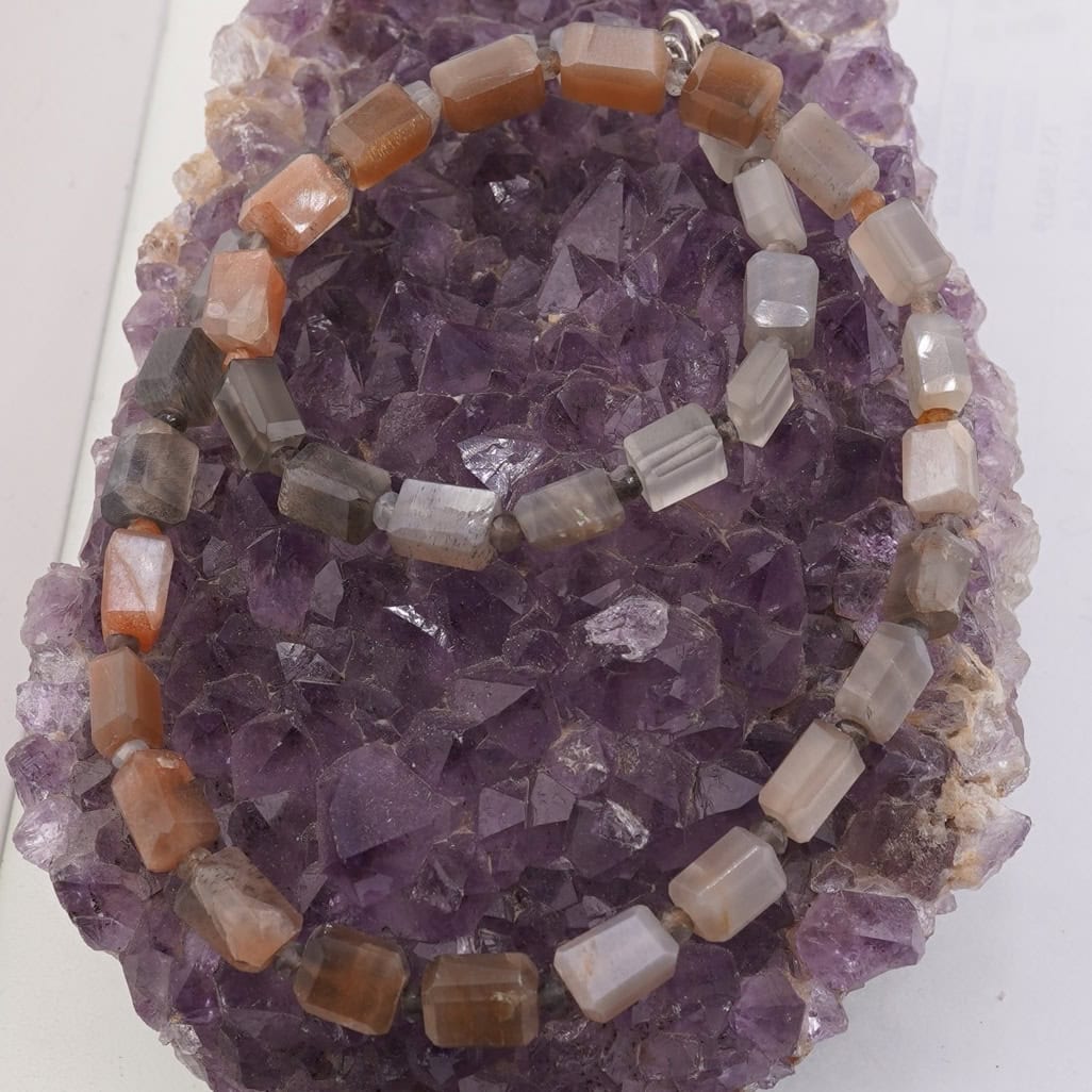 Creat pentru momentele în care vrei să fii aproape de ritmul blând al Lunii, acest set de bijuterii din Piatra Lunii îmbină eleganța discretă cu energia calmă a cristalelor naturale. Colierul, cu o lungime de aproximativ 43–44 cm, se așază confortabil la baza gâtului, iar brățara completează armonios look-ul de zi cu zi. Alternanța dintre dreptunghiurile fațetate de 8–10 mm și discurile fațetate de 4 mm creează o textură plăcută și un joc de lumină subtil, în nuanțe de gri cu reflexe portocalii calde. Setul este realizat din cristal natural 100% și este accesorizat cu componente metalice din metal comun sau argint 925, pentru o purtare plăcută și versatilă.