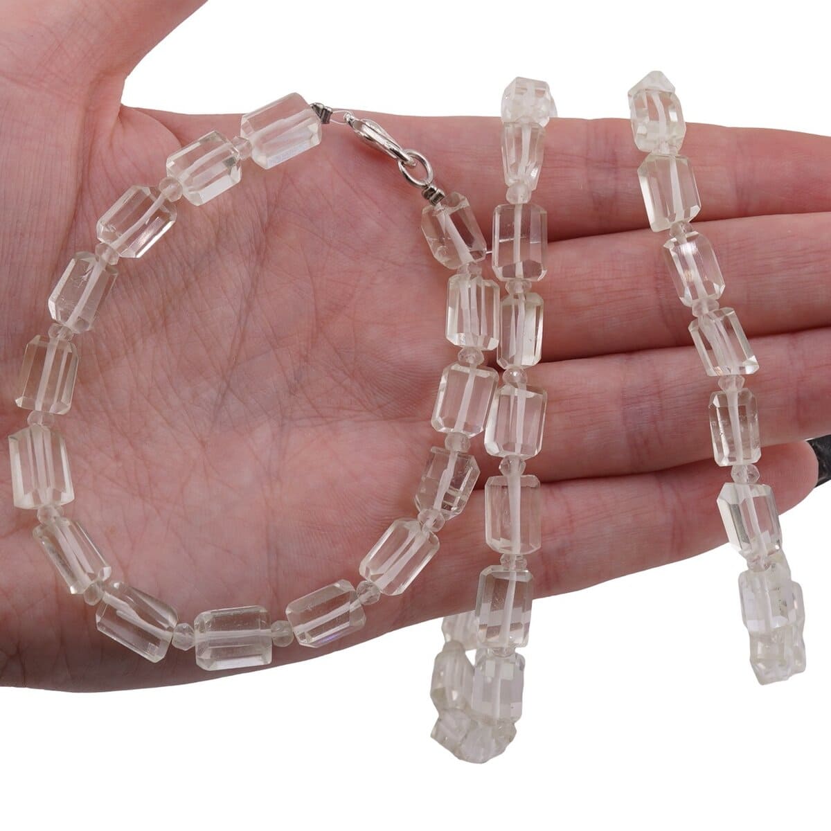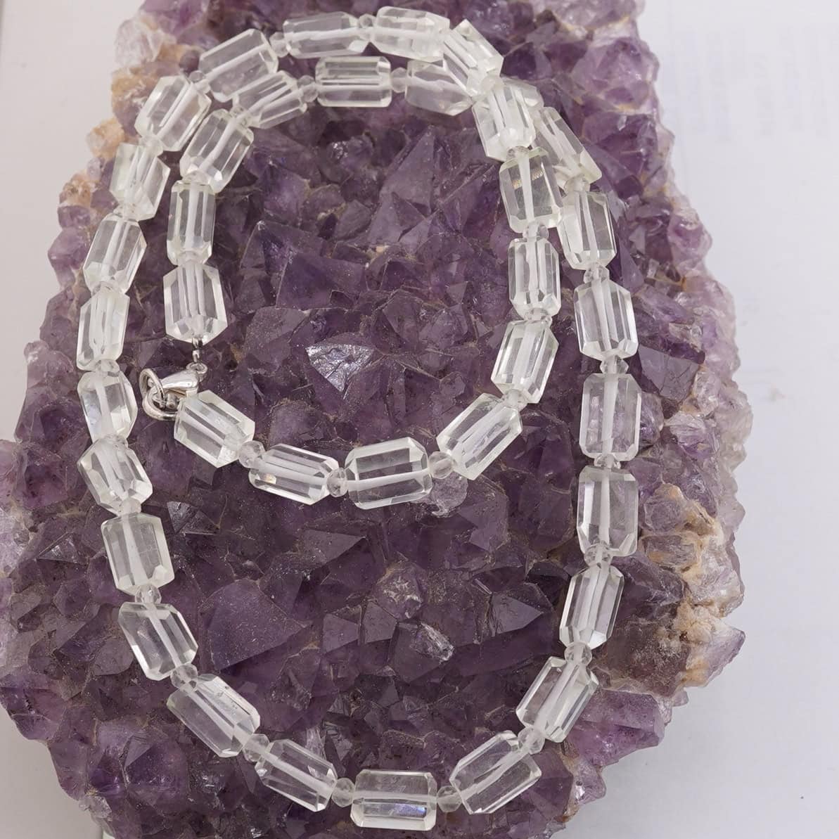 Colierul are o lungime confortabilă, de aproximativ 43–44 cm, și îmbină elegant dreptunghiuri fațetate de 9–10 mm cu accente de discuri fațetate de 4 mm. Brățara completează armonios ținuta, punând în valoare textura clară a pietrelor. Piesele sunt realizate din cristal natural 100%, montate cu componente metalice din metal comun sau argint 925, pentru un aspect curat și ușor de asortat în fiecare zi.