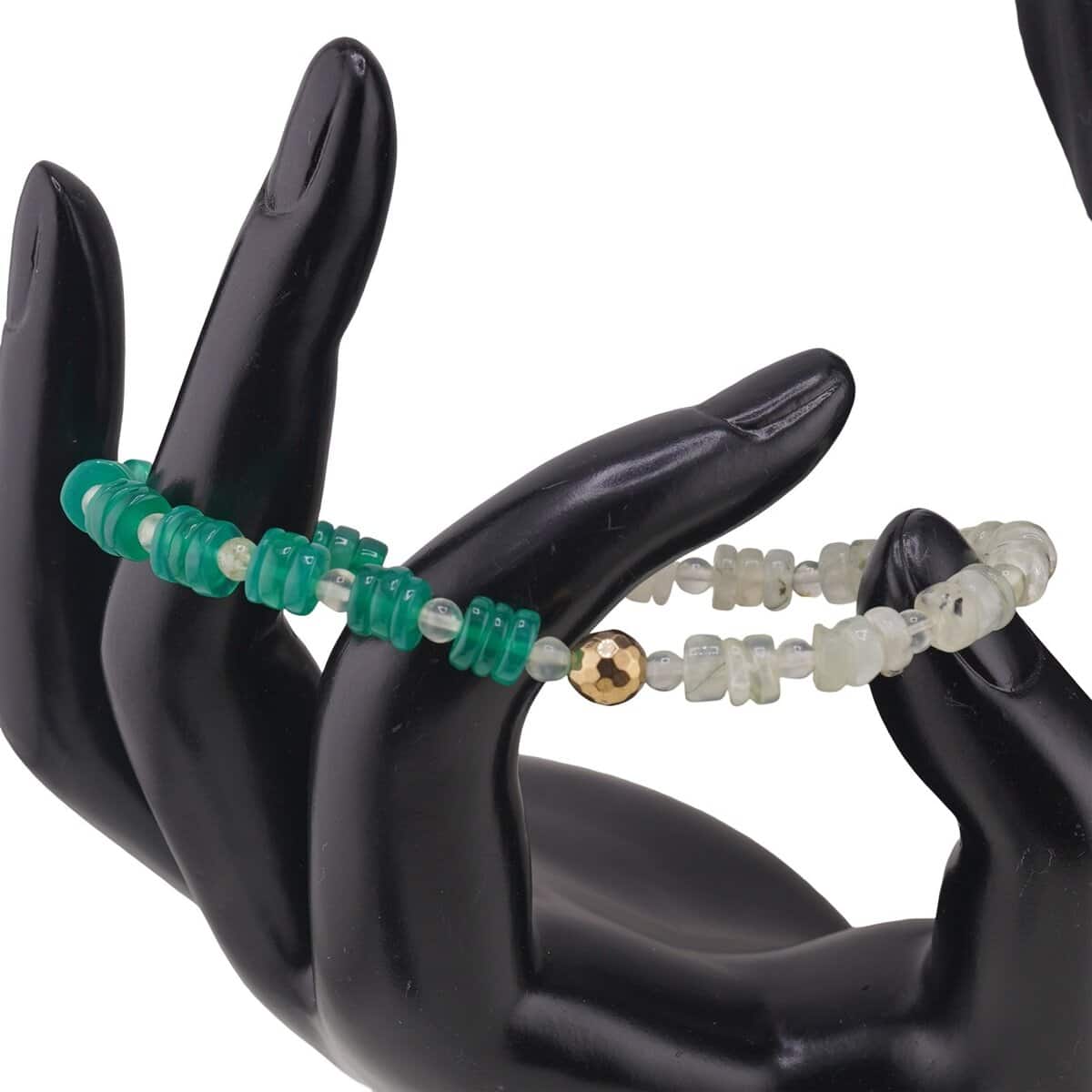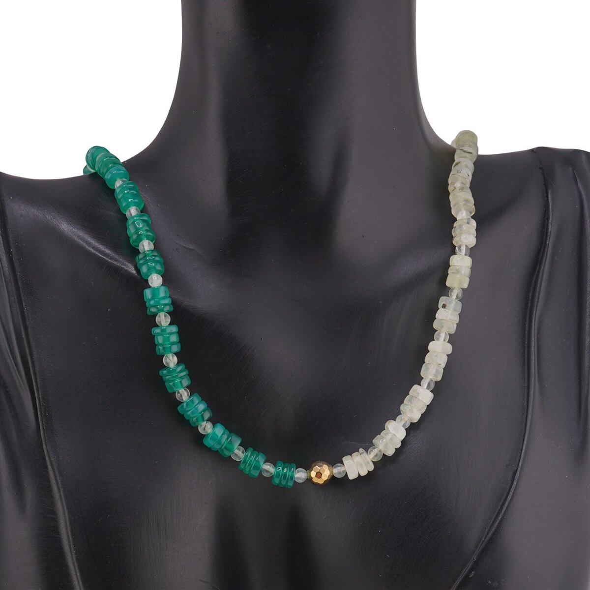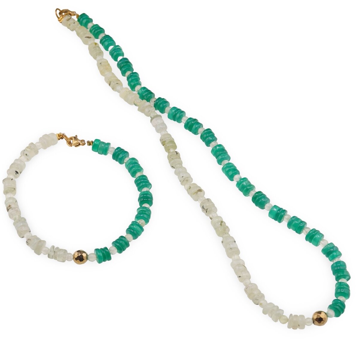 Prehnitul, prezent sub formă de sfere de aproximativ 4 mm, este cunoscut ca piatră a vindecării și a reconcilierii, asociată cu chakra inimii. Este potrivit pentru echilibru emoțional, susținerea proceselor de vindecare și deschidere spirituală blândă. Onixul verde, sub formă de rondele de 6 mm, este o varietate de calcedonie stratificată, legată de protecție energetică, curaj și voință, ajutându-te să rămâi centrat atunci când treci prin schimbări sau ai nevoie de mai multă determinare.