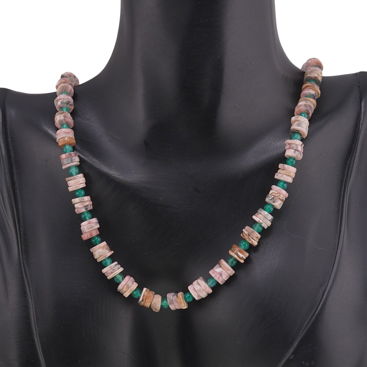 Bijuteriile sunt realizate din cristale naturale 100%, cu discuri de rodocrozit de aproximativ 6–7 mm și sfere mici de onix verde de circa 3–4 mm, dispuse armonios pe lungimea colierului de aproximativ 43 cm. Duritatea diferită a celor două pietre pe scara Mohs, rodocrozitul fiind mai delicat (3,5–4), iar onixul mai rezistent (6,5–7), aduce un plus de atenție la purtare, dar și o combinație interesantă între finețe și robustețe energetică.