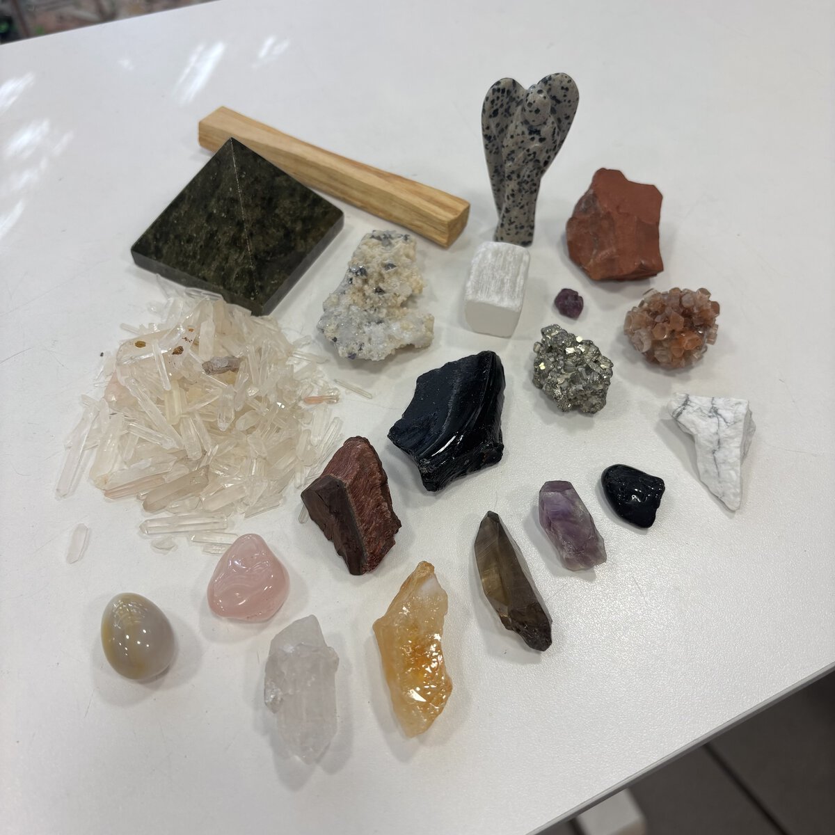 Setul contine: Lot varfururi cuart, Jasp rosu brut, piramida Jasp verde, Palo Santo, Selenit, Ochi de taur brut, Pirita bruta, Aragonit, Obsidian brut, Ametist cu varf, Cuart fumuriu varf, Cristal de stanca varf, Inger gravat Jasp dalmatian, Floare de mina pentru colectie, Citrin brut, Turmalina neagra rulata, Ou agat natural, Cuart roz rulat, Howlit brut, Rubin.
