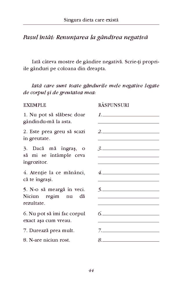 Singura dietă care există se referă la un gen diferit de dietă, o dietă care se poate ţine în pat. De fapt, îţi recomand cu cea mai mare căldură să o ţii în pat! Această dietă NU îţi impune să renunţi la alimente sau să faci exerciţii fizice. Îţi IMPUNE, în schimb, să ţii regim de gândire negativă şi să faci exerciţii mintale. Această dietă te poate ajuta să-ţi schimbi modul de a gândi, sentimentele şi aspectul. Te poate face să te simţi bine cu tine şi cu propria viaţă. Şi nu e asta tot ce ne dorim?