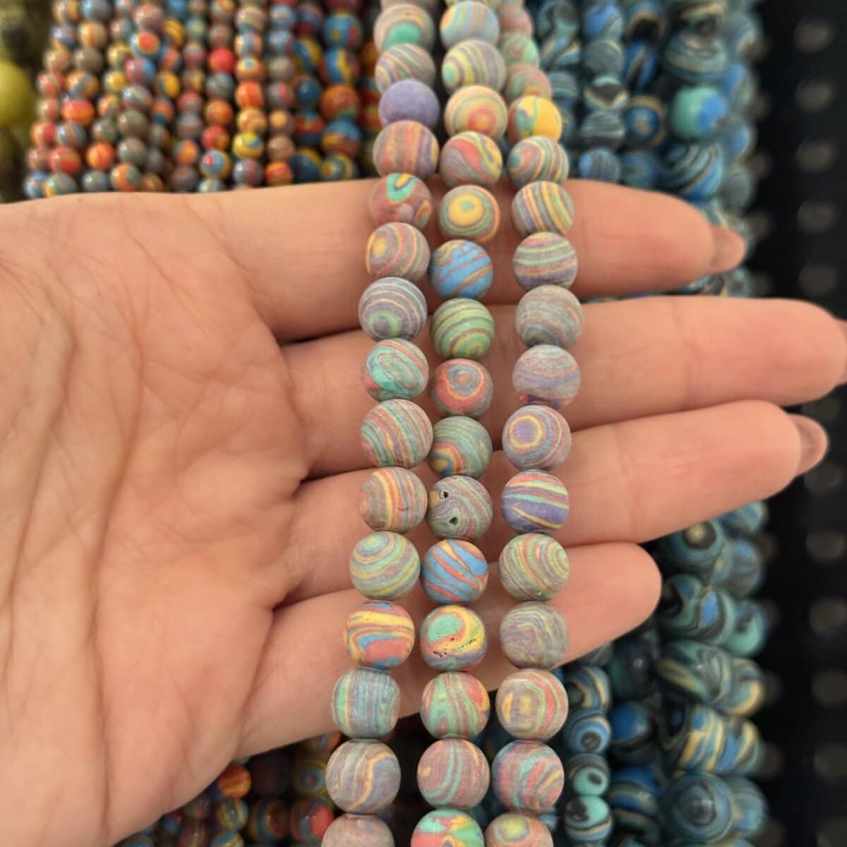 Materialul din care este realizat șiragul este un compozit pe bază de rășină, cunoscut ca cristal sintetic. Acesta îți oferă aspectul plăcut al pietrelor colorate, dar cu o greutate mai confortabilă la purtare și cu o rezistență bună în timp. Nu este vorba despre cristal natural, însă textura mată și diversitatea culorilor îl fac o alegere practică și versatilă pentru proiectele tale de zi cu zi.