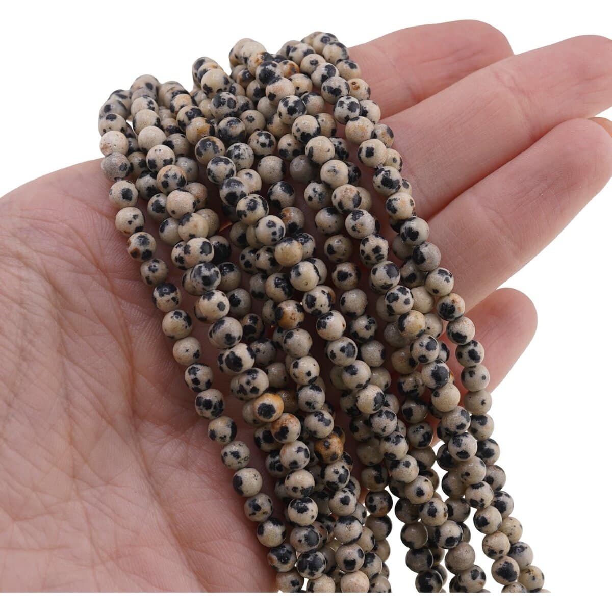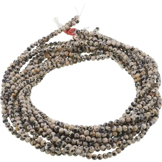 Acest șirag de jasp dalmatian este o alegere potrivită pentru tine dacă iubești bijuteriile din cristale naturale și îți dorești să creezi piese cu personalitate. Tonurile sale calde, în nuanțe de crem presărat cu pete neregulate de negru, dau fiecărei mărgele un aspect jucăuș, ușor de recunoscut și plăcut de integrat în aproape orice combinație de culori.