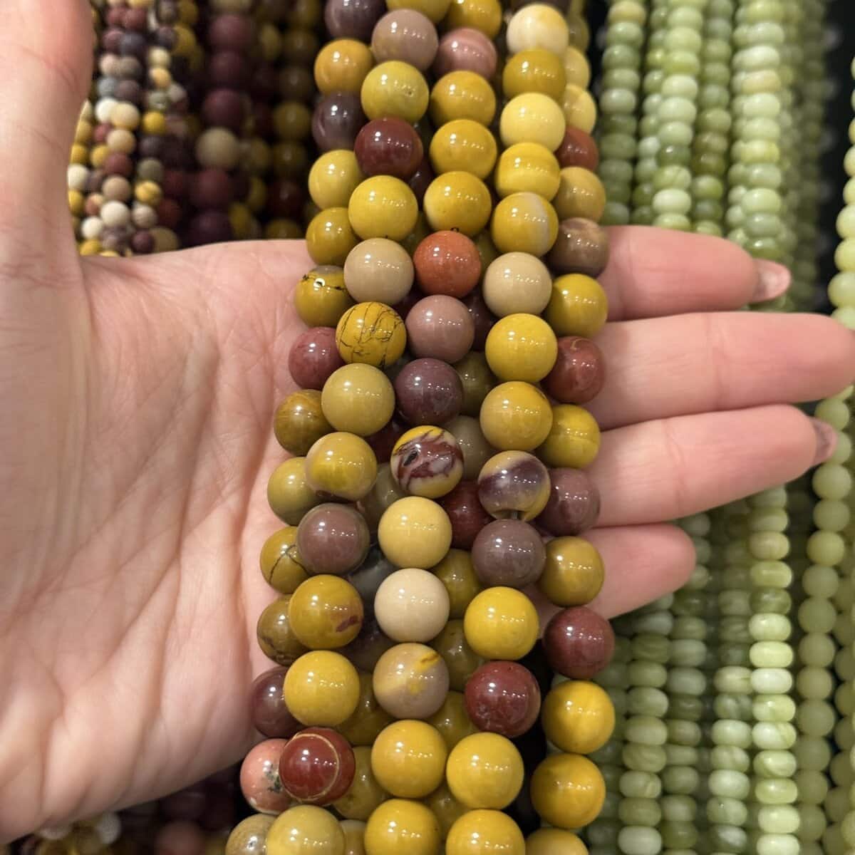 Siragul conține un singur șir de sfere, suficient pentru a da naștere unei bijuterii cu prezență, dar totuși ușor de purtat. Dacă îți dorești un proiect creativ care să te conecteze mai mult cu tine, acest sirag de Mookait poate deveni un partener de încredere: te invită să creezi, să îți exprimi stilul personal și să aduci în viața ta mai multă căldură, stabilitate și curaj de a merge înainte.