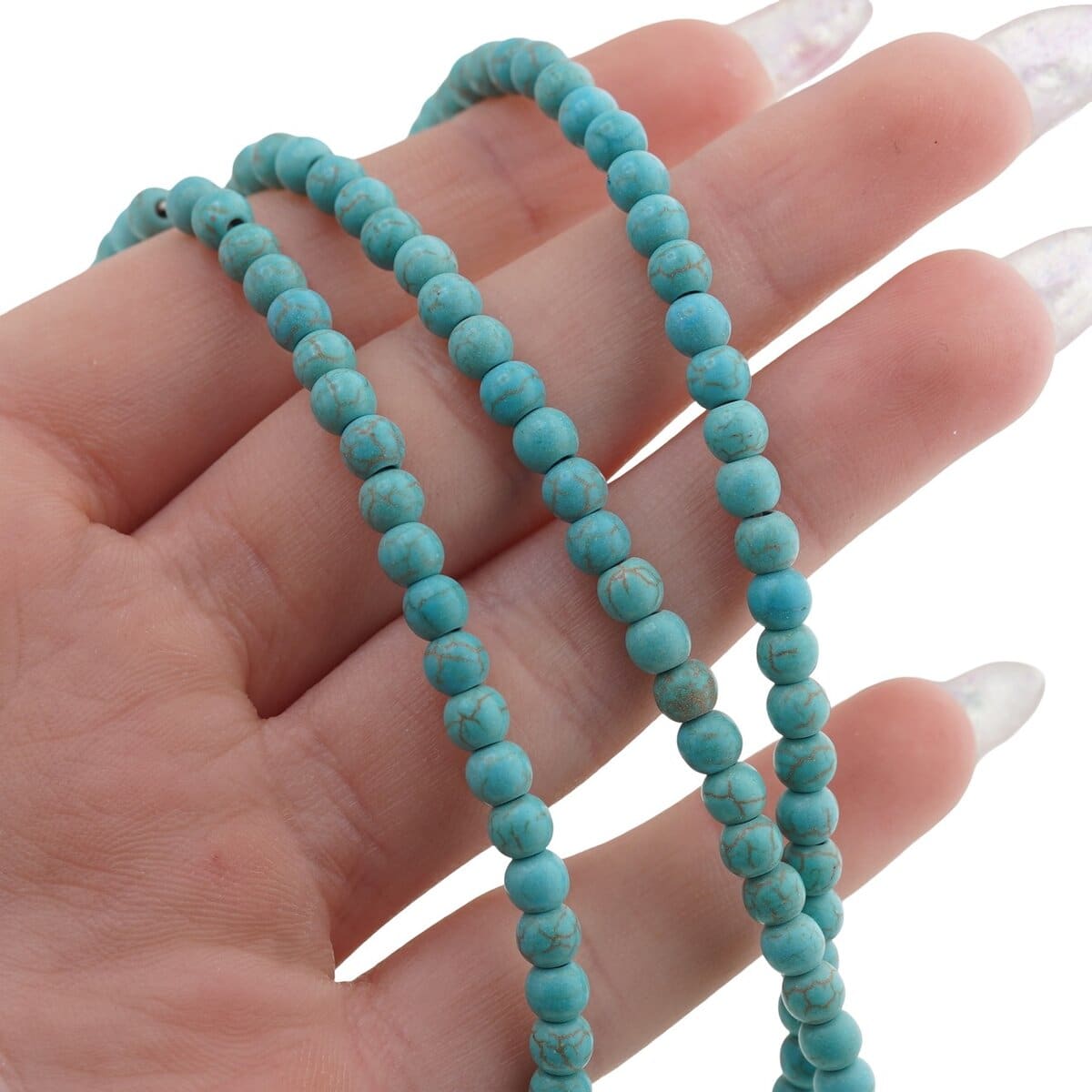 Acest șirag din turcoaz albastru deschis este potrivit pentru tine dacă vrei să creezi bijuterii care transmit calm, claritate și deschidere în comunicare. Mărgelele rotunde, cu diametrul de aproximativ 4 mm, sunt realizate din cristal natural de turcoaz, ulterior vopsit, pentru a evidenția nuanța blândă de albastru și pentru a păstra, în același timp, farmecul pietrei naturale.