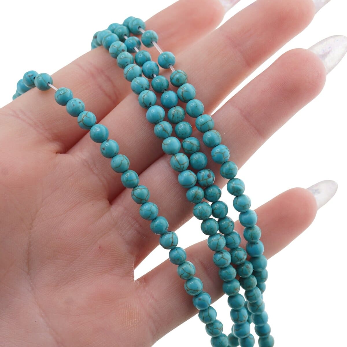 Turcoazul din acest șirag este natural, dar vopsit, astfel încât nuanța de albastru să fie intensă și armonioasă pe toată lungimea. Datorită formei rotunde, fiecare sferă se așază frumos în coliere, brățări sau cercei, oferind un aspect echilibrat și plăcut la purtare. Duritatea pe scara Mohs este de aproximativ 5–6, ceea ce îl face un cristal potrivit pentru bijuterii de zi cu zi, cu o îngrijire adecvată.