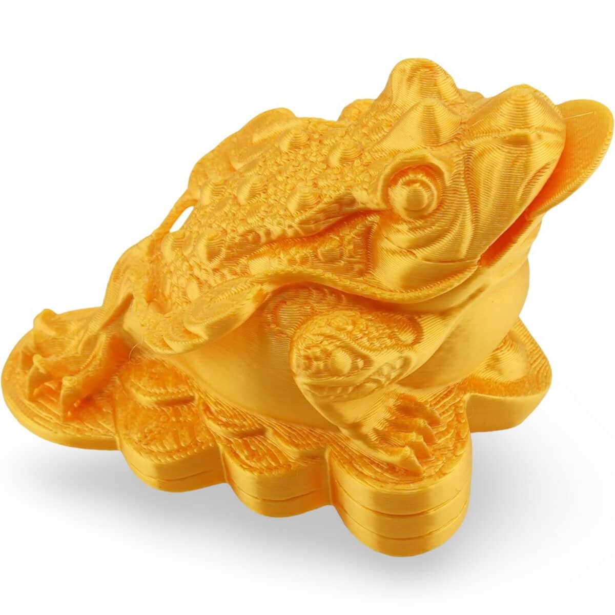 Broasca raioasă cu trei picioare este redată într-o formă armonioasă, așezată pe un mic soclu ce include monede chinezești și o pepită, elemente considerate simboluri ale bogăției și oportunităților materiale. Culoarea aurie pune în evidență aceste detalii și creează o asociere vizuală directă cu abundența și cu fluxul banilor.