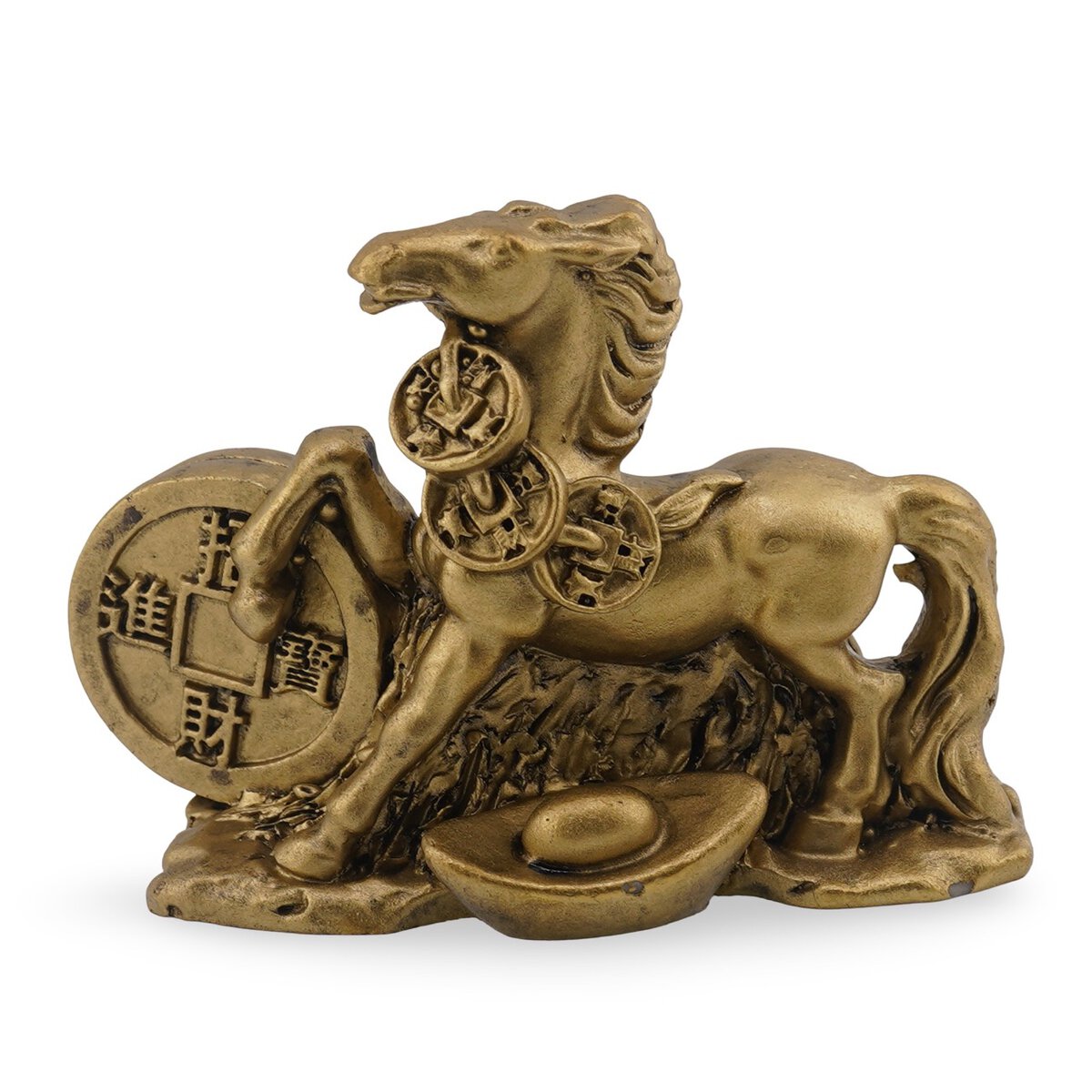 Statueta Feng Shui din rasina Cal auriu cu moneda, salba si pepite, 9cm