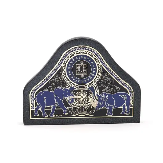 Această statuetă Feng Shui reprezintă o tabletă de protecție împotriva furtului, având gravate simbolurile puternice ale elefantului și rinocerului. Elefantul simbolizează norocul, puterea și stabilitatea, în timp ce rinocerul aduce protecție împotriva energiilor negative și a furturilor.