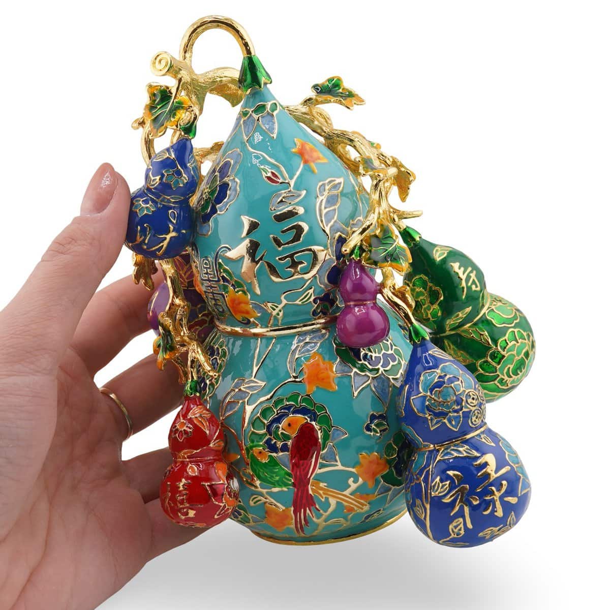 - Acest grup magnific de 9 Wu Lou este simbolul suprem al sănătății și al vieții lungi - nu doar pentru corp, ci și pentru minte și spirit. Fiecare Wu Lou este pictat cu motive de bun augur, inclusiv fazani aurii pentru armonie, monede și lingouri pentru bo