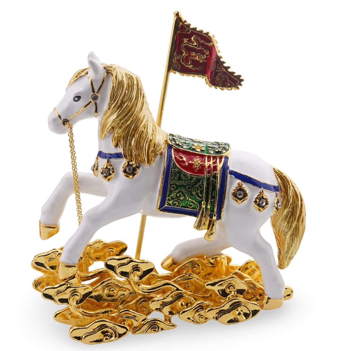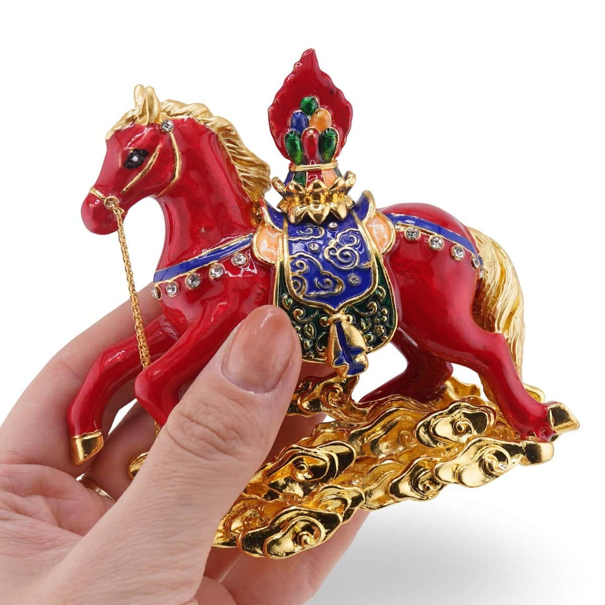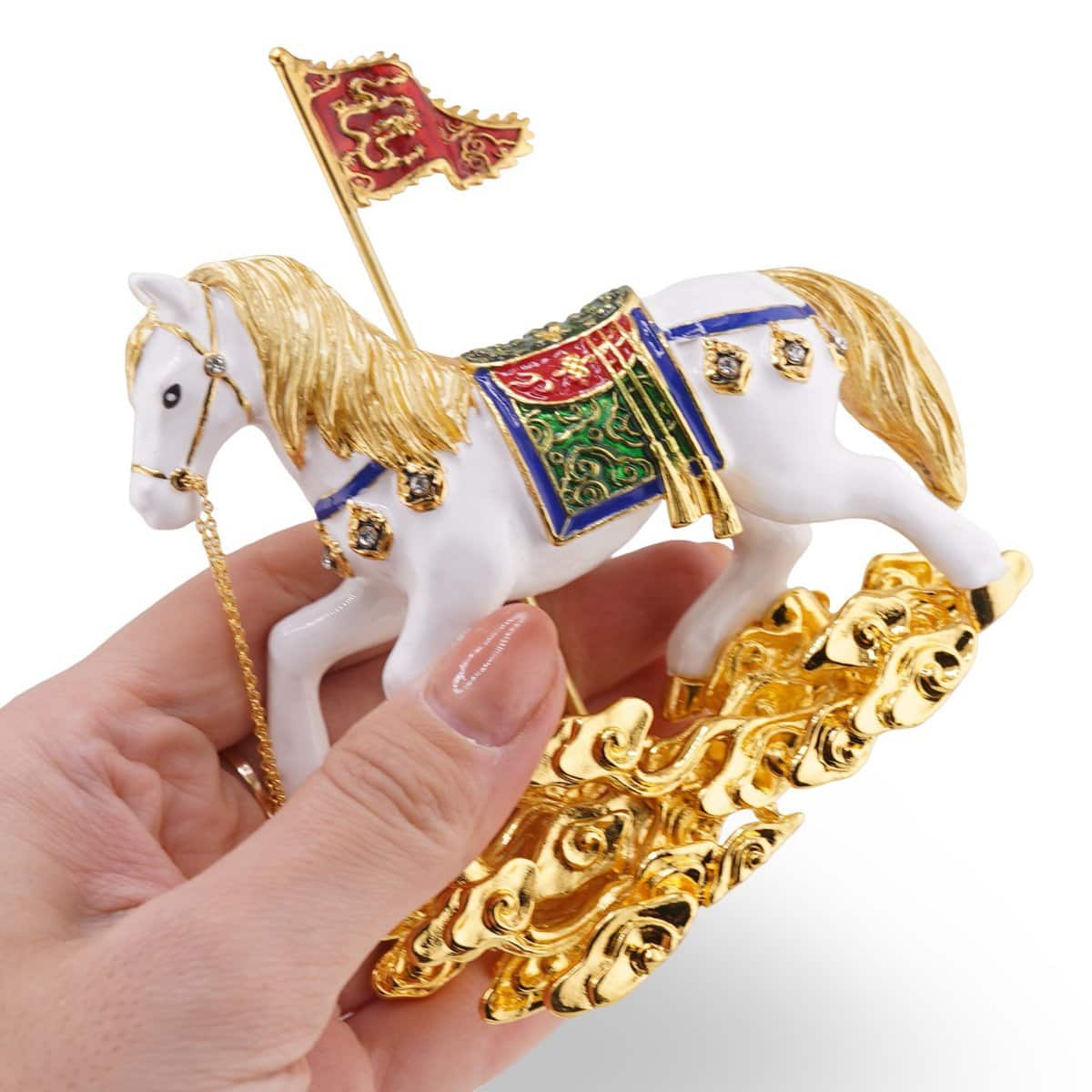 Trinitatea Cailor aduce împreună trei armăsari legendari într-o compoziție armonioasă, creată pentru a te inspira în 2026. Realizată din metal și finisată într-o paletă multicoloră, statueta surprinde dinamismul și eleganța mișcării, astfel încât să te conectezi ușor cu energia de progres și claritate. Calul Valiant, în roșu, poartă Bijuteria Flaming a succesului, un simbol al motivației și al curajului. Calul Victoriei, în alb, ridică Steagul Victoriei cu emblema Dragonului, chemând determinarea și concentrarea în momentele cheie. Calul Tribut, în maro, completează triada și susține echilibrul ansamblului.