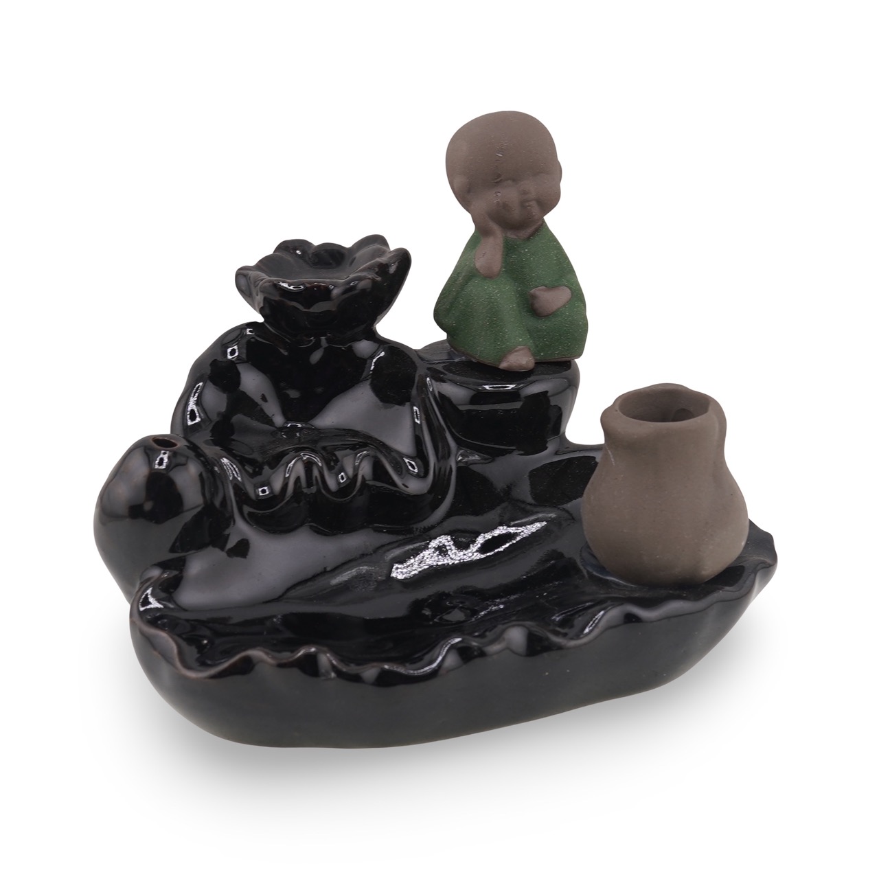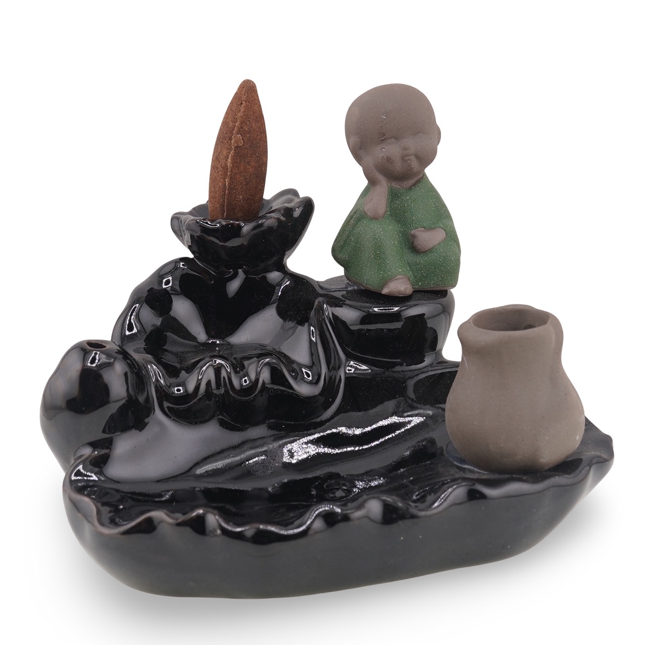 Suport ardere conuri parfumate cascadă – backflow, Călugăr Zen pe stânci și Vas din lut