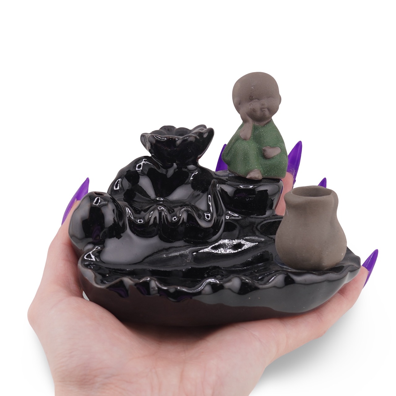 Atunci când așezi un con parfumat special pentru backflow în partea superioară, fumul începe să curgă ușor în jos, ca o mică cascadă ce se prelinge peste stânci, în timp ce călugărul Zen pare să mediteze în liniște. Efectul vizual este calmant și îți poate transforma colțul de relaxare într-un spațiu în care respiri mai ușor și te reconectezi cu tine.