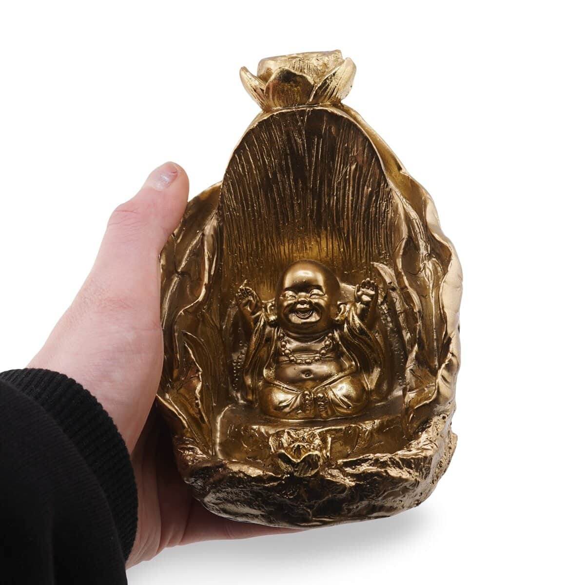 Acest suport pentru conuri parfumate tip cascada backflow cu Buddha vesel este o piesă decorativă care aduce un plus de farmec momentelor de relaxare. Realizat din rășină și finisat într-o nuanță aurie, suportul este gândit pentru arderea conurilor speciale backflow, astfel încât fumul să curgă în jos în valuri line, creând efectul vizual de cascadă. Aspectul său îl face potrivit atât pentru aromaterapie, cât și pentru decorarea unui colț liniștit din casă sau birou.