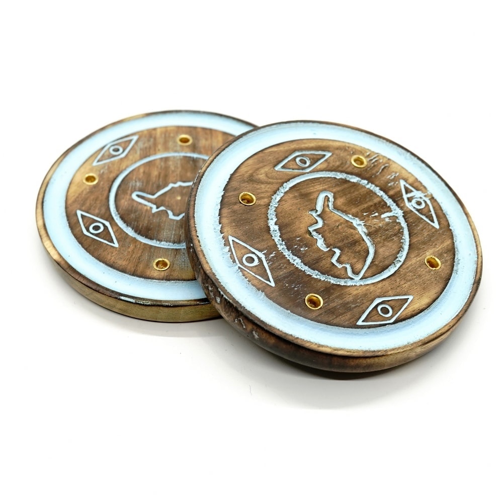 Suport lemn ardere betisoare parfumate rotund cu elefant, bleu - 8cm