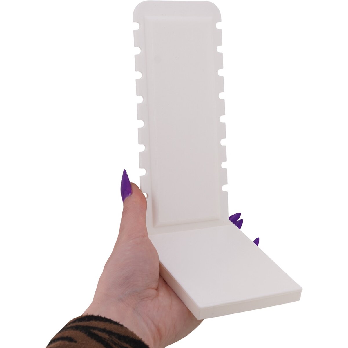 Suportul este format din două piese, detaliu care îți ușurează montarea și mutarea lui dintr-un loc în altul. Îl poți așeza lângă oglindă, pe măsuța de toaletă sau în zona în care îți păstrezi celelalte accesorii, pentru a crea un colț ordonat și estetic. Culoarea albă se integrează ușor în orice decor interior și pune discret în valoare strălucirea metalelor și a cristalelor.