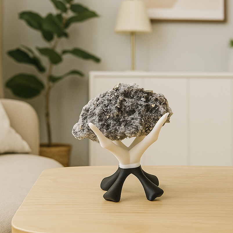 Gândit pentru a evidenția frumos piesele tale preferate, acest suport pentru cristale cu patru brațe oferă stabilitate și un aspect curat, potrivit pentru pietre semiprețioase și sfere. Brațele susțin delicat obiectul, lăsându-l vizibil din toate unghiurile, iar proporțiile echilibrate – cu un diametru de aproximativ 8,5 cm și o înălțime de 9,5 cm – îl fac ușor de integrat pe birou, pe o etajeră sau într-o vitrină.