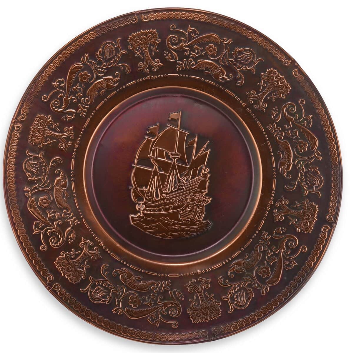 Tablou vintage din cupru gravat, model corabie și motive florale, 30cm