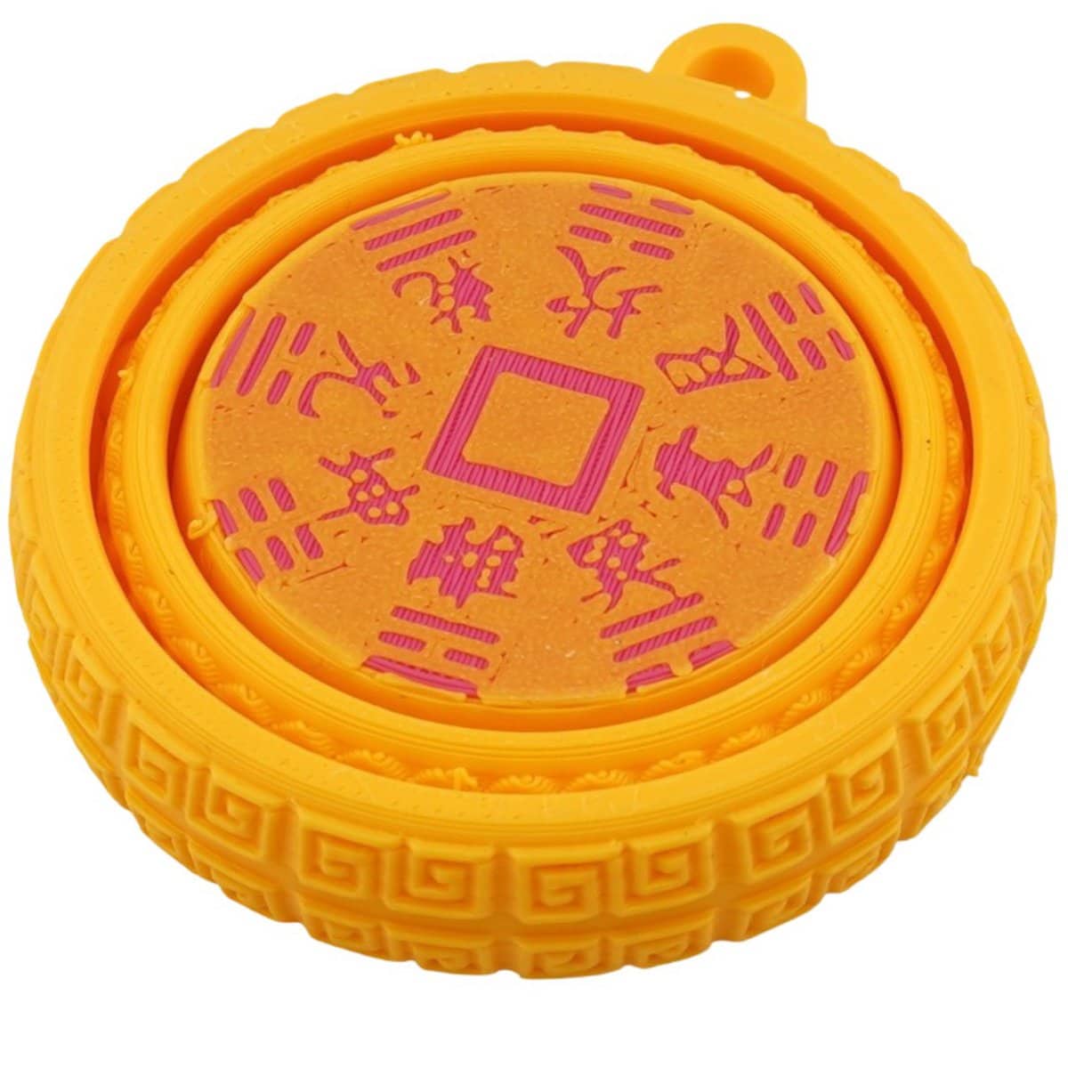 Conține simbolul Bagua cu trigrame de protecție, caractere chinezești ale prosperității și pătratul central al monedelor tradiționale, fiind un talisman feng shui pentru echilibru și noroc.