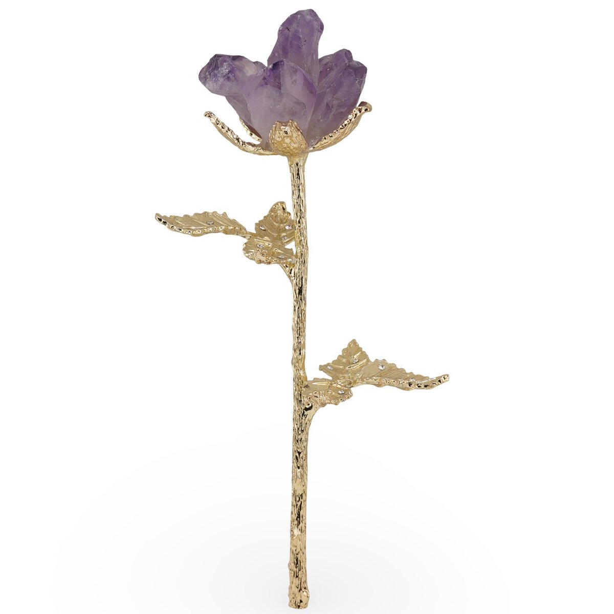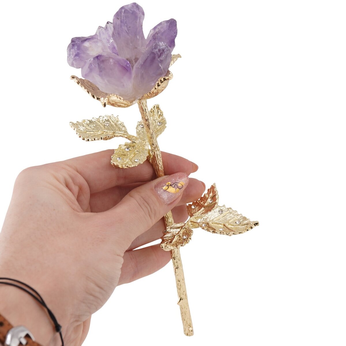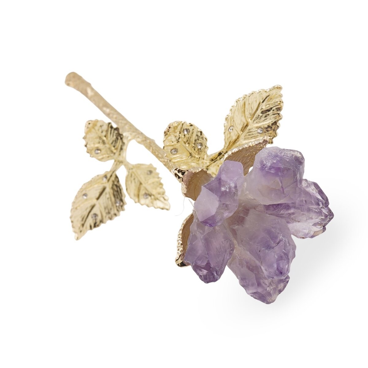 Trandafirul din ametist brut și metal auriu, cu o lungime de aproximativ 21 cm, este o decorațiune care aduce în același loc eleganța metalului cald și energia liniștitoare a cristalelor naturale. Realizat din ametist și cuart roz, montate pe o tulpină fină din metal auriu, acest trandafir este gândit pentru tine dacă îți dorești mai multă claritate, calm și stabilitate emoțională în spațiul în care trăiești sau lucrezi.