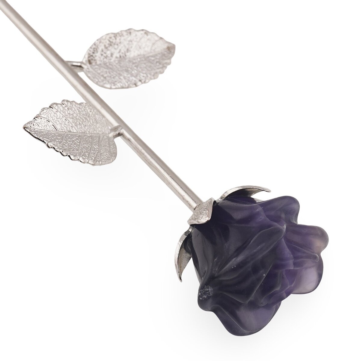 Trandafirul din metal argintiu cu Fluorit este o decorațiune delicată, creată pentru momentele în care ai nevoie de mai multă claritate interioară și liniște. Cristalul natural de fluorit, nuanțat discret în tonuri de mov, este pus în valoare de structura metalică ce conturează forma de trandafir, oferind o prezență elegantă pe birou, noptieră sau în spațiul în care îți petreci timpul de reflecție.