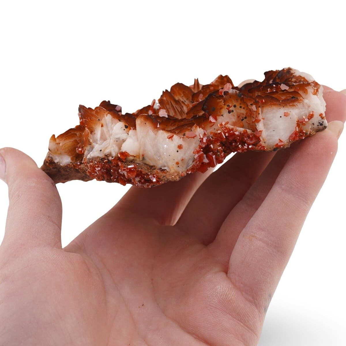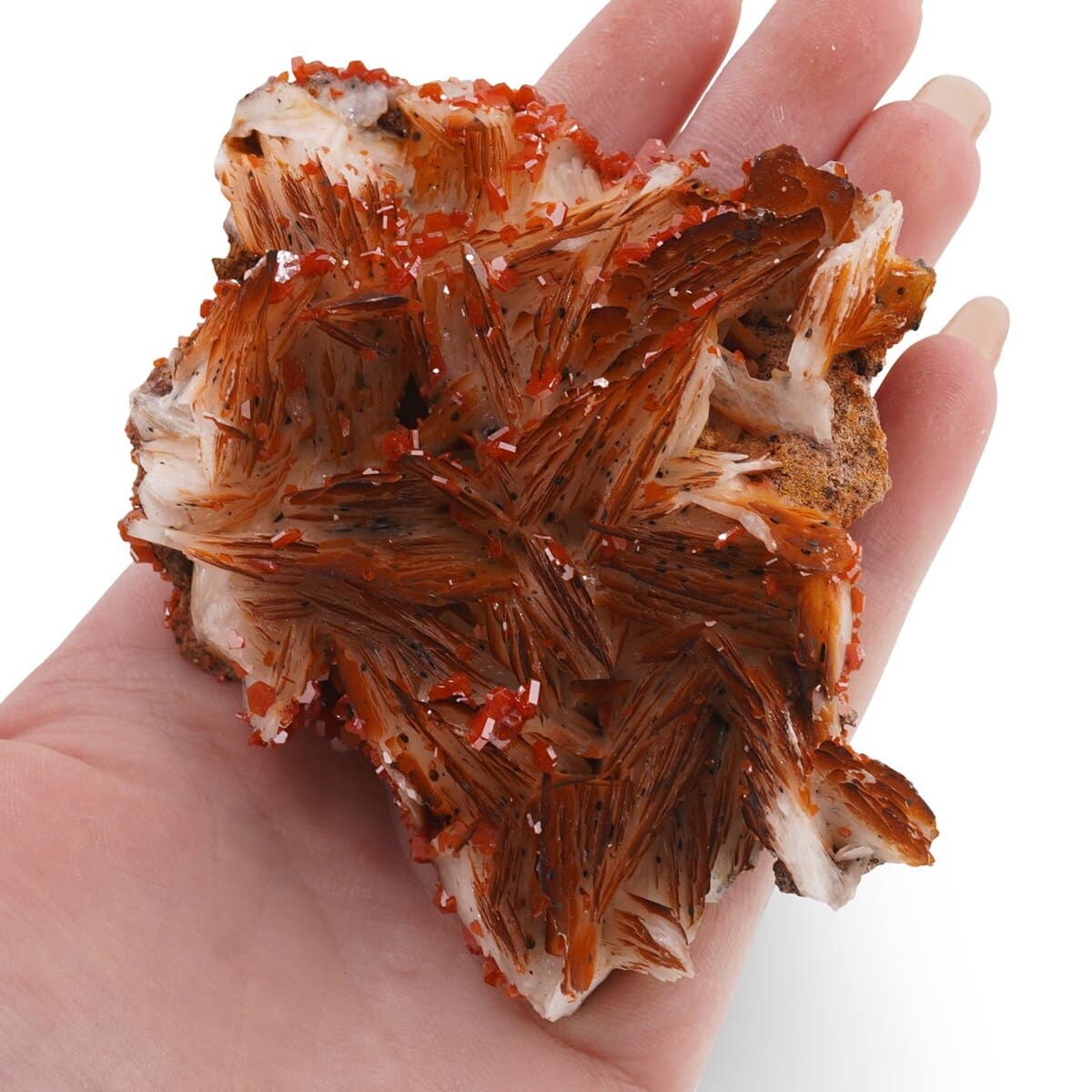Având dimensiunile de 9 cm x 7,5 cm x 2 cm și o greutate de 158 g, acest cristal brut poate fi așezat cu ușurință pe un raft, pe birou sau într-un spațiu dedicat colecției de minerale. Baza de barită pune în valoare structura vanadinitului și oferă piesei un aspect natural, specific cristalelor unicat. Tocmai această formare autentică face ca fiecare exemplar să aibă farmecul său propriu și să fie ales nu doar pentru aspect, ci și pentru caracterul său aparte.