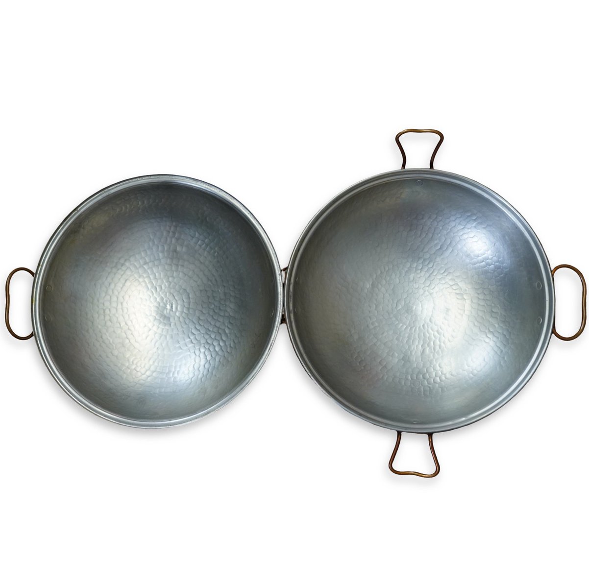 Interiorul cositorit oferă nu doar un aspect plăcut, ci și protecție suplimentară pentru materialul de bază. Cuprul este cunoscut pentru tonurile sale calde și pentru felul în care reflectă lumina într-un mod subtil, creând o atmosferă primitoare. În combinație cu finisajul ciocănit manual, rezultatul este un obiect care îmbină tradiția meșteșugului cu simplitatea designului rustic.